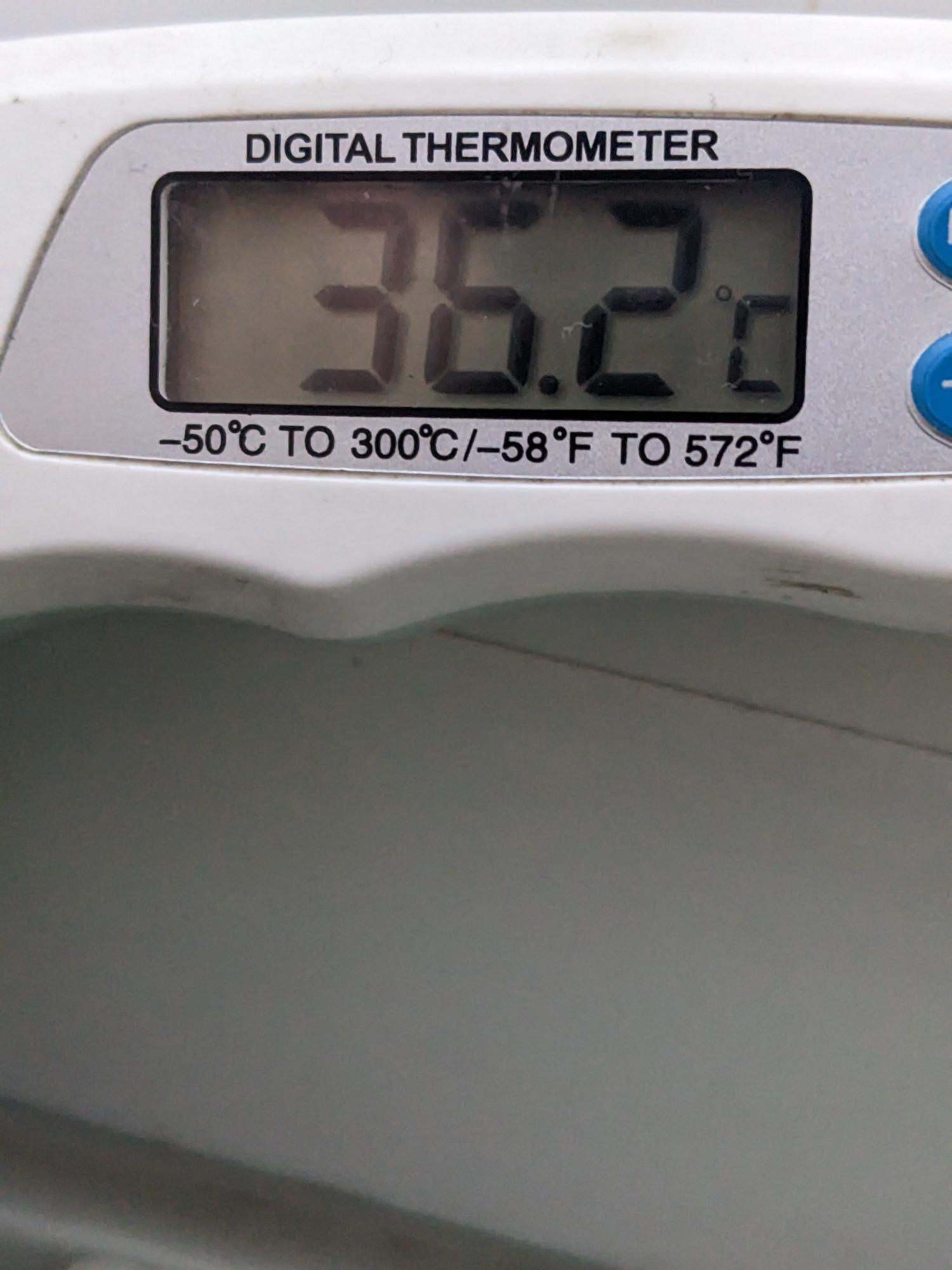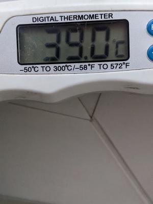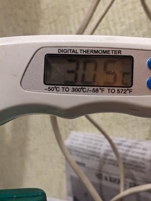 Побоялся дальнейшего роста температуры электролита, для усиления конвекции, стал охлаждать противоположную стенку холодным воздухом из приоткрытой двери зимнего холодильника. Сейчас температура электролита уже упала до 27 градусов. Норма.