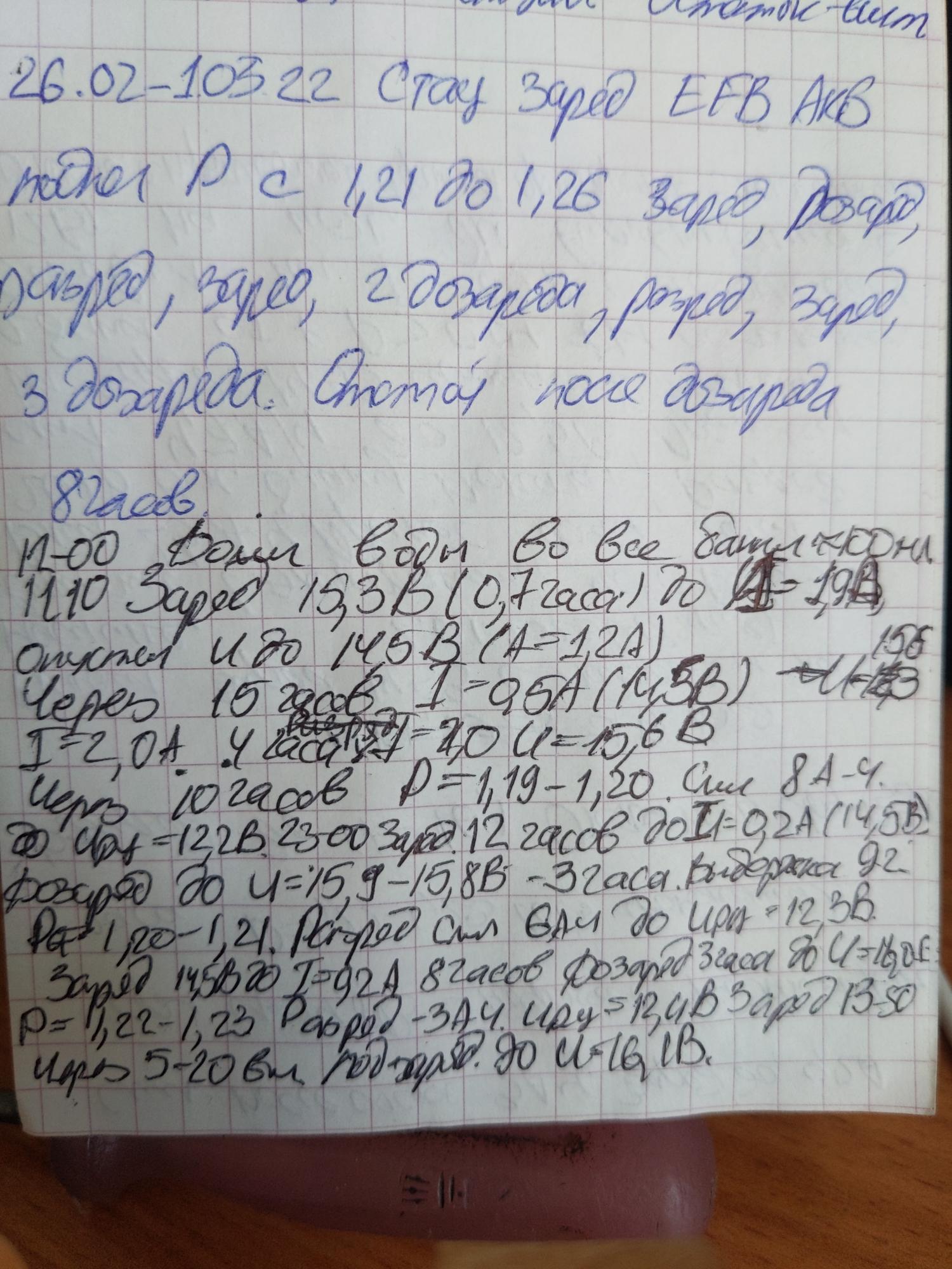 Поскольку в своей работе я опираюсь на опыт Виктора Vectorа. В одном из роликов он привёл рукописную таблицу соответствия напряжения всей АКБ и плотности самой слабой банки, оттуда я и взял значение 12.47 В. Можете меня поправить, если я ошибся. Но слегка снизившаяся плотность самой слабой банки после разряда подсказывает мне, что всё в порядке.