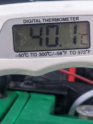 Ещё через 18 часов зарядный ток уменьшился до 0,4 А. Это мне понравилось, так как я ожидал увидеть минимальные значения типа 0,2 А.  Картинка поменялась после измерения температуры электролита. 40,1 градусов. Занавес...