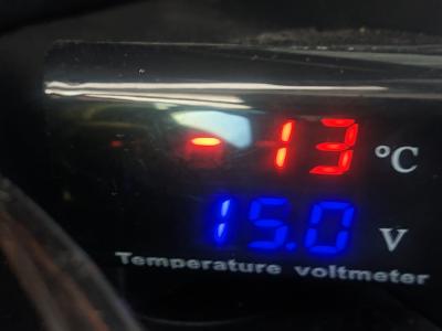 После 48 часов заряда плотность электролита вверху банок  при температуре -13 градусов была 1,33!  На дисплее температура остывшего АКБ и напряжение бортовой сети при -26 градусов при контрольном запуске двигателя.