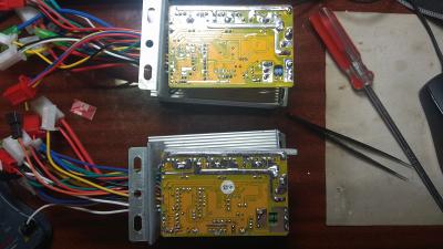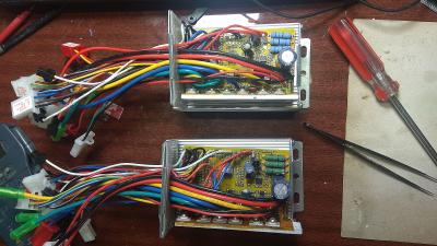 Всем привет. Собрал первый самокат с полным приводом. Заказал контроллеры 350w 17A  - дешевый, как основной, и 500w на второе колесо как ускоритель-помощник. Когда посылка пришла, навесом проверил контроллеры - колеса вращались ( с 350ткой все как надо, а 500ник давал малые обороты). Дошло дело до монтажа в самокат. Как ни странно - дешевый работает без каких либо нареканий, разве что не разобрался в торвозах (их будто и нет), а вот старший брат начал пудрить мозги. Зацепил оба контроллер на одну ручку газа с общей массой и сигнальным, 500wй  завел через отдельную кнопку, но при включении обороты он не набирал... Были какие то мелкие дергания, но это ладно - перекунул фазные провода и закрутилось, но как то вяло и только на малом газу (если давал больше вращение прекращалось). Дошло дело до разбора. Внутри все по стандартному - по китайски, заметил моргание красного индикатора (не разобрался к чему он сигналил), также после вкл питания грелись 3 больших резистора сами по себе. В общем на след. день каким то образом контроллер вообще перерастал подавать  признаки жизни ( питание было откл. и никто не трогал), высоковольтная часть питается как положенно,  а вот 5В молчит... Прошу совета, помощи может кто что подскажет как быть
