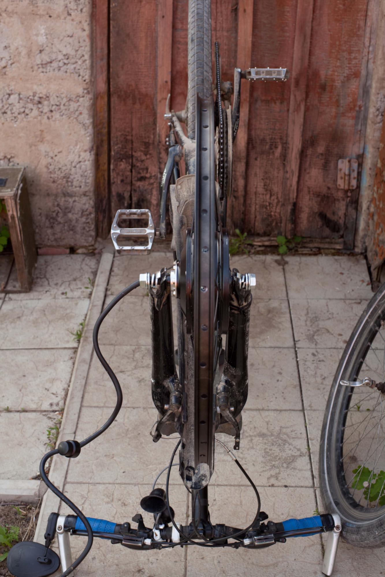 Вилка стоит относительно заднего колеса ровно и технически снято всё нормально, выглядит всё именно так как на фото, центр колеса смещён вбок, притом на дофига..