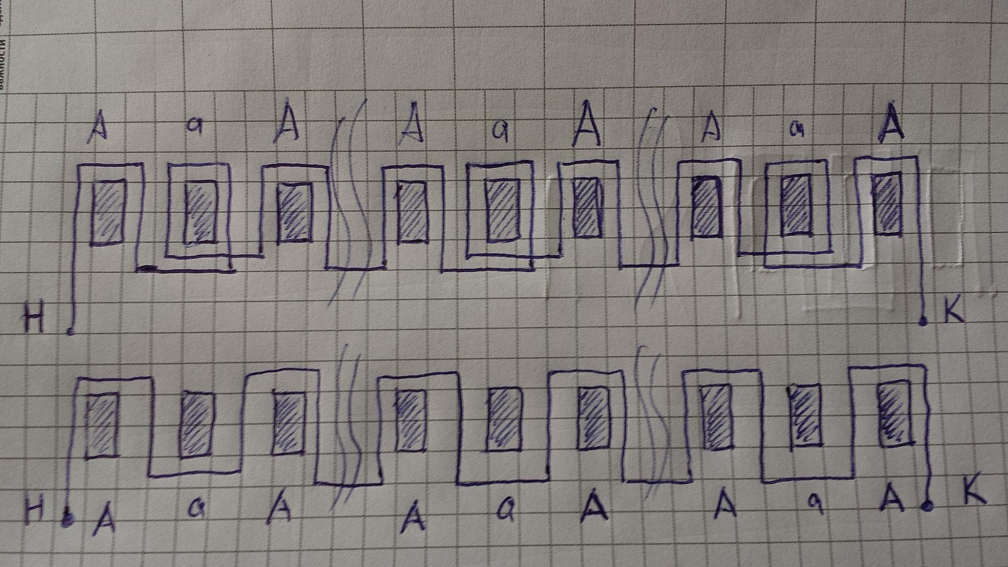 верхний рисунок считаю более правильным, средняя часть из трех магнитов будет сильней магнитить. там виток с хвостиком.