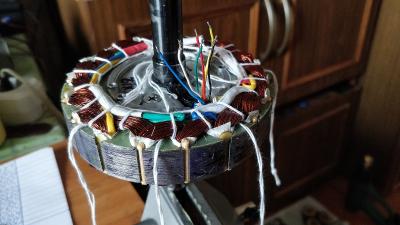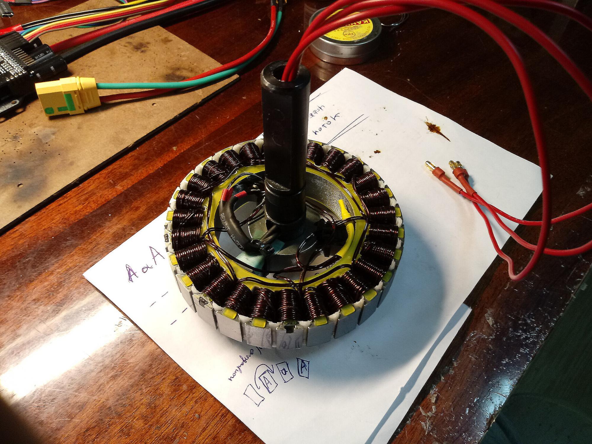 Колесо гироскутера 8" было намотано каким-то немедным проводом. Перемотал проводом 2x0.8, витков получилось в 2 раза меньше, но я этого и хотел. А вот сопротивление слишком большое для такого Kv, мало меди уложил. Холлы сломал.