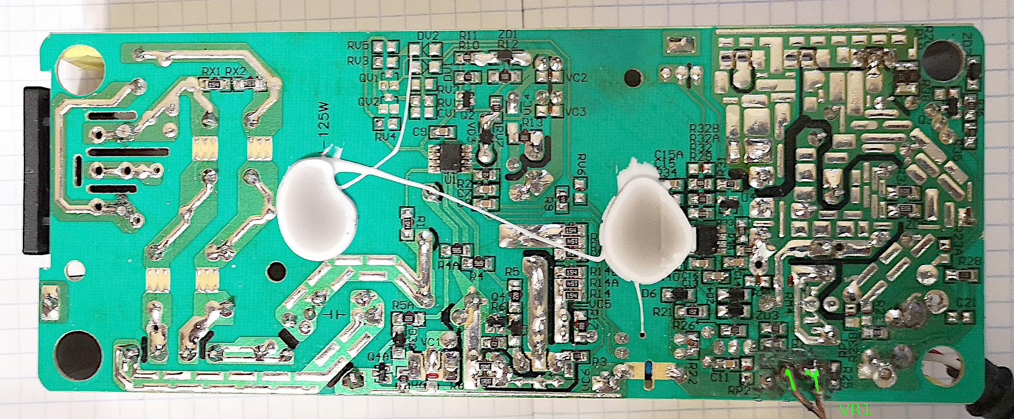 С помощью подстроечника VR1 (у которого 3 контакта и 2 из них спаяны вместе) можно уменьшить это сопротивление хоть до пары Ом, но что удается выжать это около 39.1В. Сопротивление VR1 для 37В выходит где-то 300-400Ом или около того (для измерений не выпаивалось).