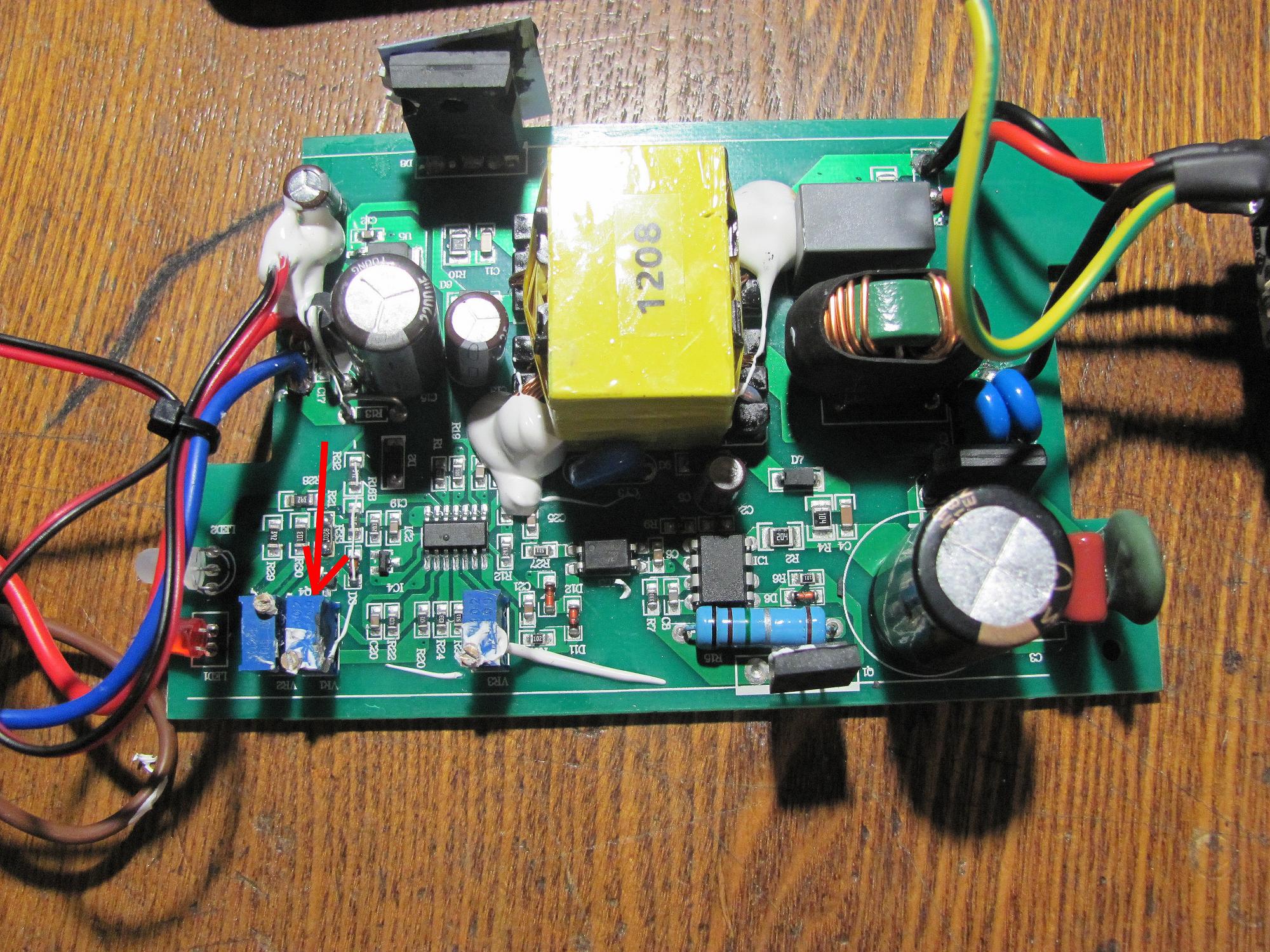 Вспомнил что без дела валяется зарядник 4 ампера 14,6 вольт. Вскрыл, там два подстроечника. За напряжение отвечает помеченный стрелкой. Но больше чем до 18 вольт не поднимает. Рядом на плате место для такого же. Впаял, но вообще ничего не происходит, как будто его нет. Жаль, думал к делу приспособить.