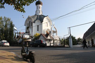 Сегодня 20-го октября в воскресенье после обеда я забрал свой самокат из мастерской. Разгон стал более бодрый прямо с места, без отталкивания ногой. Сразу по прямой самокат взял скорость не менее 35 км/час. На маленькие горки стал просто запрыгивать. Впереди предстояло взять мою любимую гору, где я живу. И он это сделал, поднял себя в 43 кг и меня в 100 кг с общим весом примерно в 150 кг на гору прямо на тройной перекрёсток улиц Альпийская, Пятигорская и Дагомысская, где расположен Свято-Успенский Георгиевский храм на Старом городском кладбище. Навигатор "GARMIN" показал высоту 88 метров над уровнем моря.