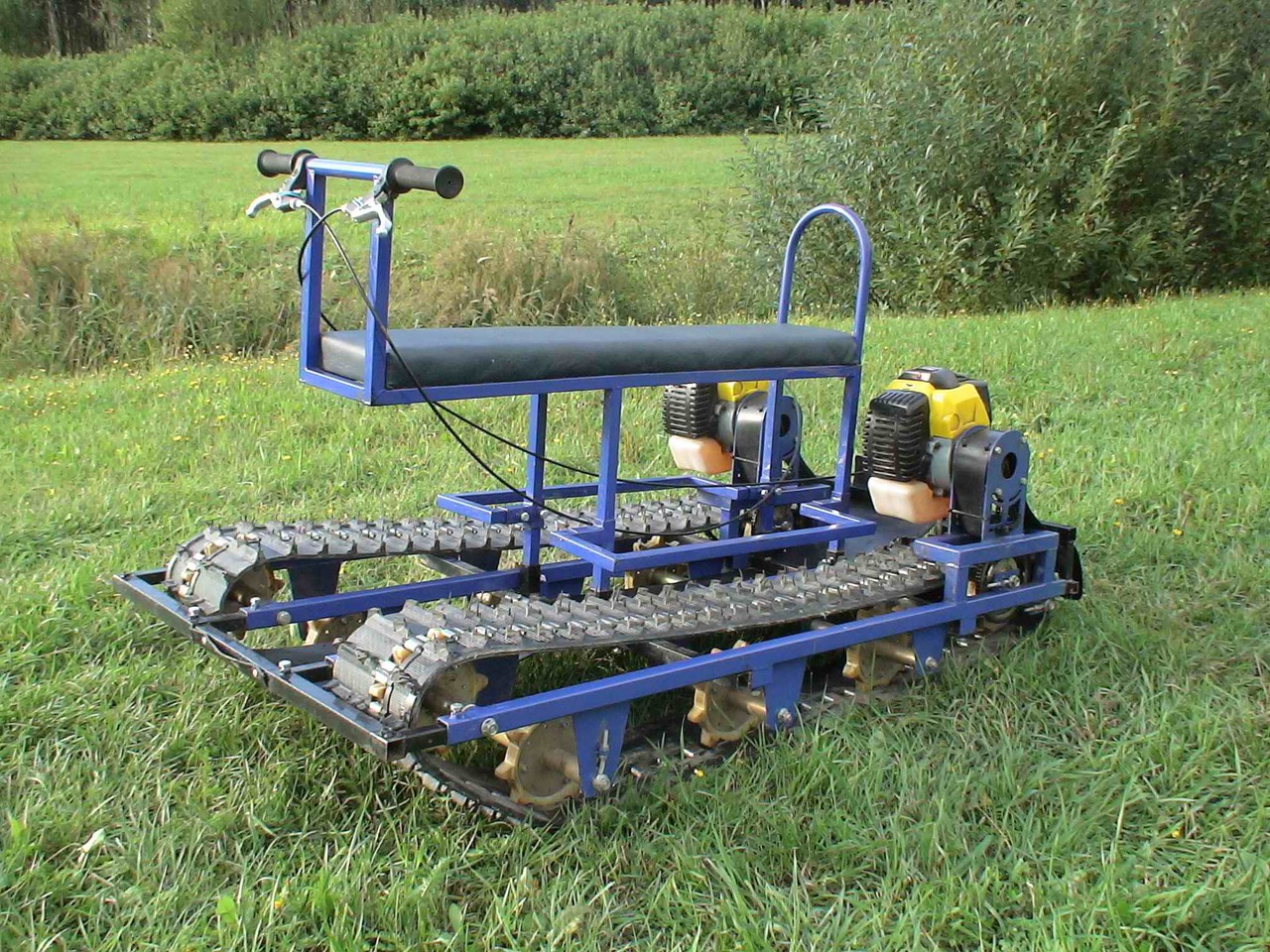 В качестве движков пара ДВС 43см.куб от  газонокосилок по 2л.с.. Но как резво тянут!