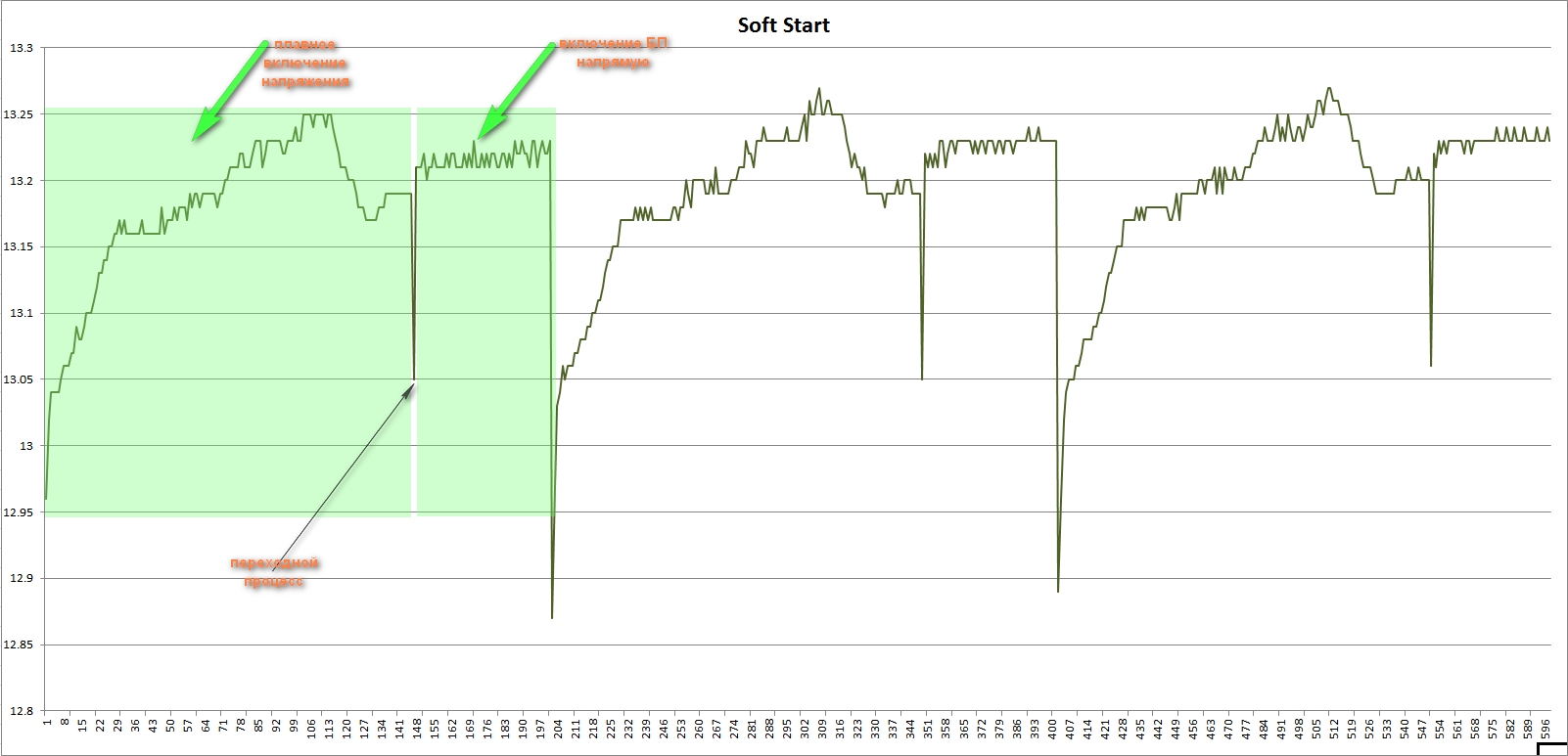 Что значит подключение БП напрямую ? А до этого как было?  Что такое soft start, его длительность, параметры?