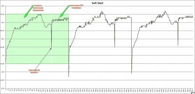 Спрашиваю про второй график.  Впадина проявляется только при мягком старте? А на жестком ее нет? Чем вызвана впадина и почему в конце ее резкий выброс вниз и потом ровное плато?