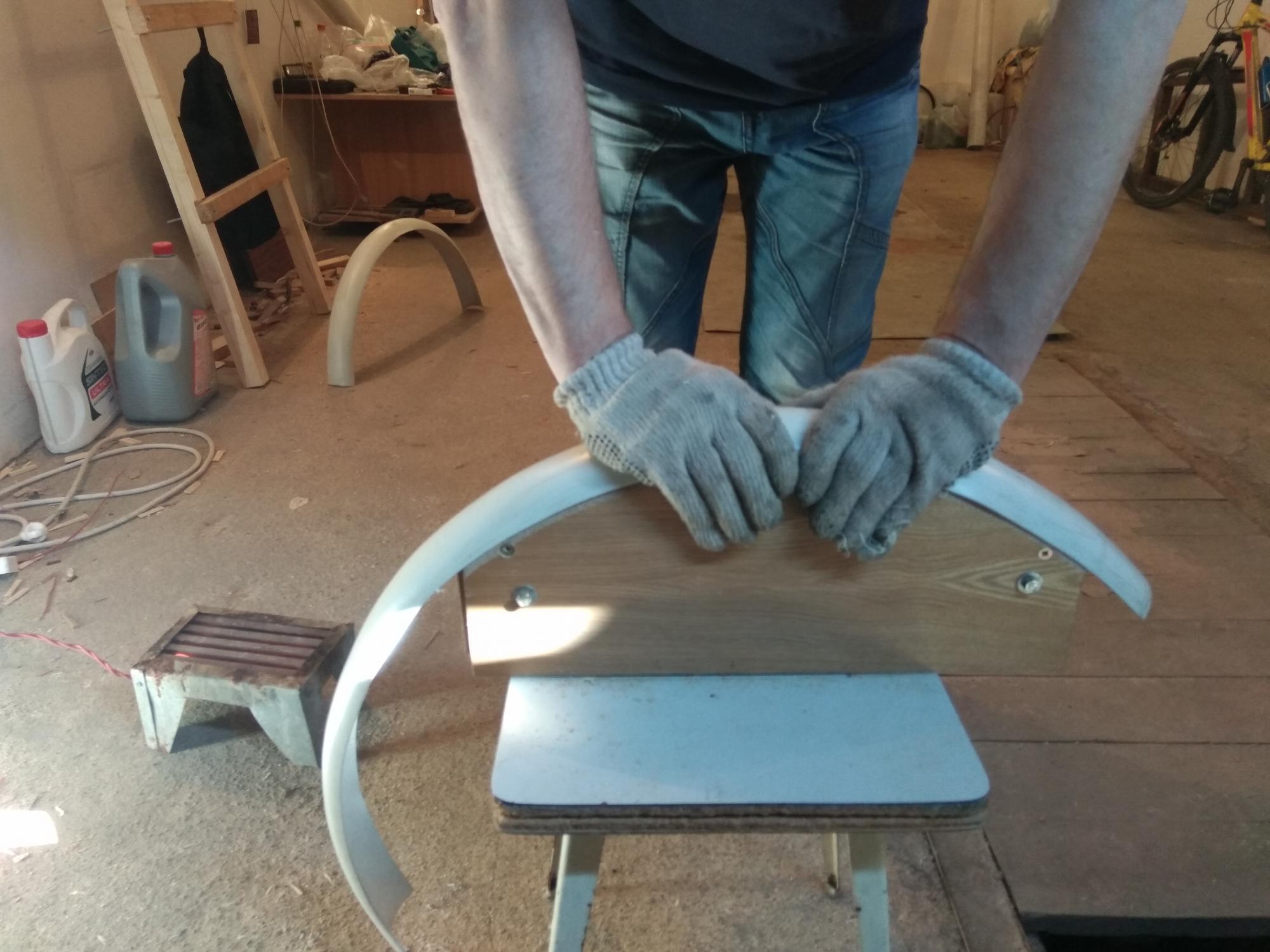 Делали с другом на выходных крылья на вел. Хоть еще и не доделали но процесс изготовления очень прикольный. Сначала стянули 4 ламинированные ДСП по 18мм  . закруглили на радиус 35 см.  Придали форму округлости. Взяли пластиковую трубу канализационную. Отпилили чуть больше метра (вымеряется по месту и хотелке) ширину тоже по месту мы сделали 8.5 см нагревали и формировали. Труба изначально диаметром 100 ка. Грели на плитке до размягчения ( за неимением строительного фена) лучше делать вдвоем что бы 1чел натягивал по оправке второй прижимал сверху на оправку. Перчатки обязательно надеть что бы не жгло руки.