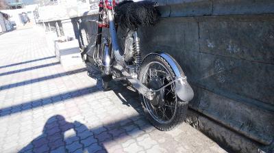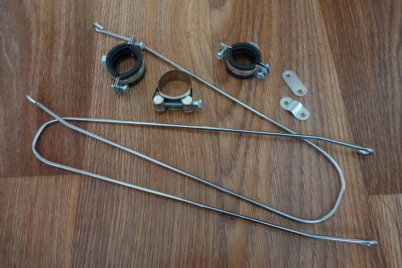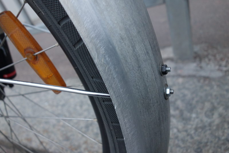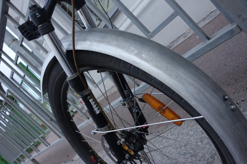 Сегодня, наконец-то, поставил одно из двух крыльев. По нашей погоде без них уже никак невозможно. Крылья алюминиевые, шириной более 80 мм, очень аккуратно сделанные (спасибо уважаемому [user]vasili377[/user] :ку: ). Толщина материала - 1,5 мм, вес одного крыла - ок. 350 граммов. Крепил поверх короны вилки и на хомуты из автомага, стоимостью 80 руб. за штуку (весят - ого-го) :~-( (спасибо за наводку ув. [user]Феникс[/user]). Также в ход пошли усы, которые были в хозяйстве от старого комплекта стальных крыльев, но никогда не использовались. Кроме того, была употреблены в дело две металлические пластины (3 руб/шт.), которые я изогнул бессмысленно и беспощадно. Одну, для верхнего крепления крыла - буквой "Г", вторую, для усов - буквой "Омега". Теперь крыло бы полирнуть и будет  :wow:.