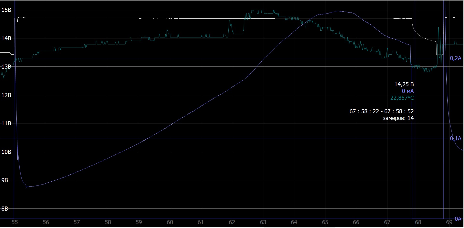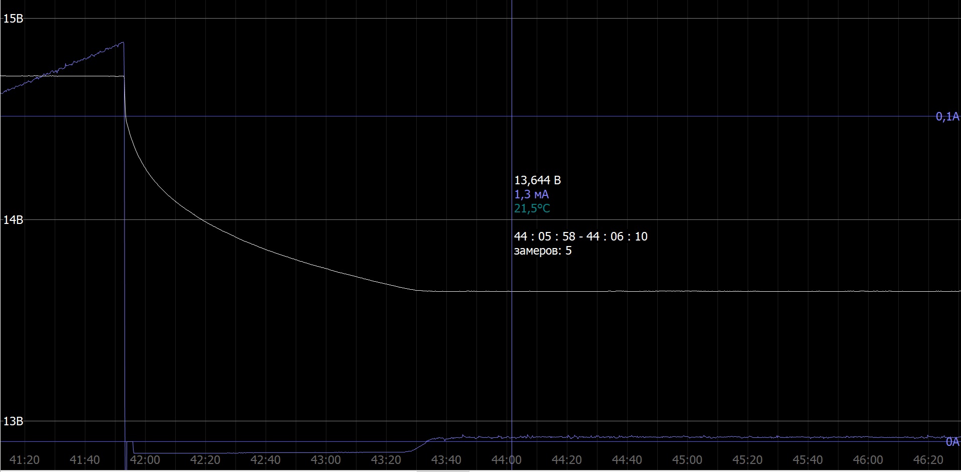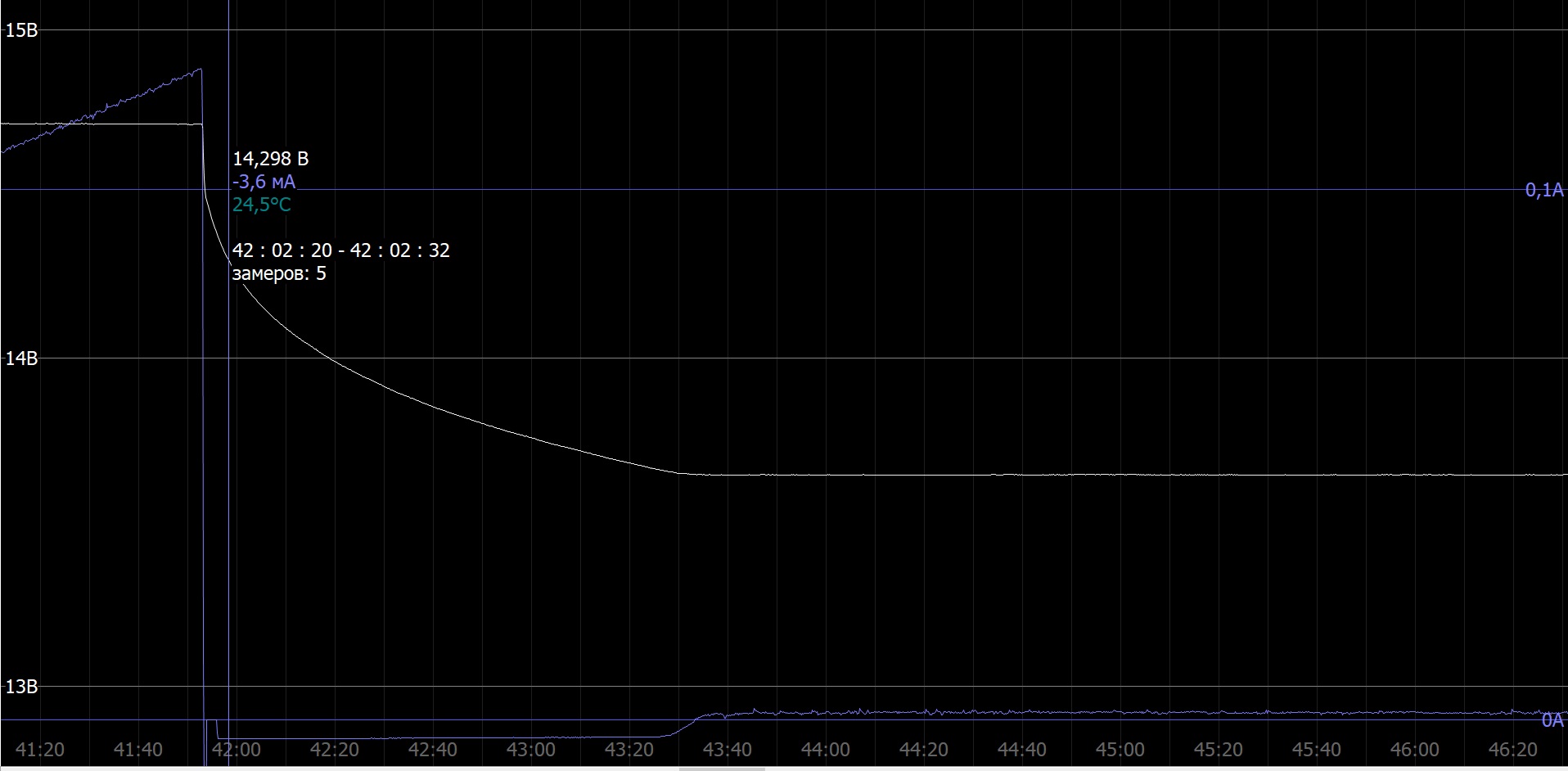 В данном случае увеличение тока, в основном, происходит из-за работы системы рекомбинации газа (ОАМ нагреваются при окислении кислородом), которая работает при подаче положительного тока на клеммы батареи.  Если мы отключим ток  - оставшийся в ячейке кислород окислит отрицательные пластины, тем самым разрядит их. Дабы такого не происходило - рекомендую на несколько часов (не менее 3-х) снизить напряжение до буферного ~ 13,62 В.