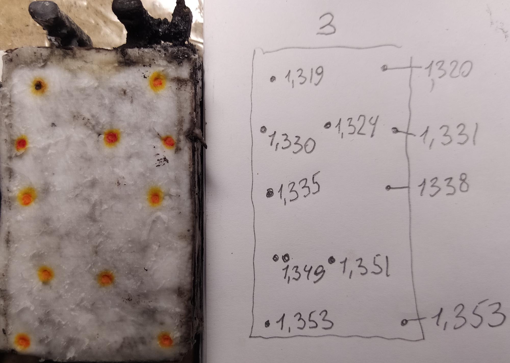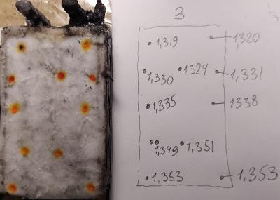Дабы Вы не думали, что кислота равномерно распределяется в стекломате - публикую фото, где точками на стекломате показаны места из которых брались пробы (слева), справа на бумаге продублировал сии точки и написал плотность электролита.