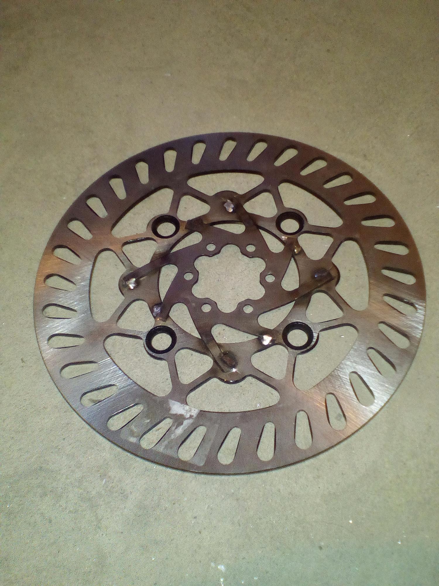 Я бы так не делал. Если не ошибаюсь, мото диски имеют толщину порядка 4мм, а вело двух. Плюс ослабление из за сварки. А что мешает воткнуть целиком диск от вела?