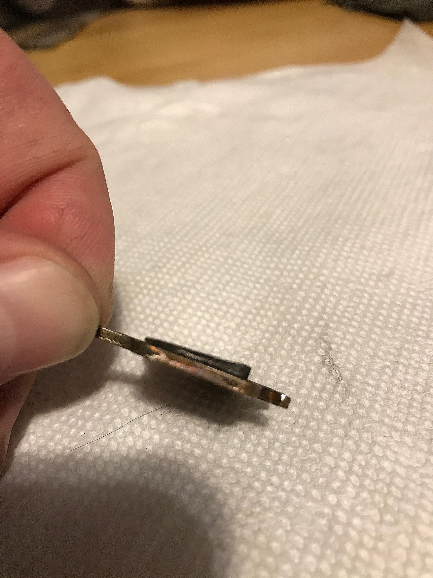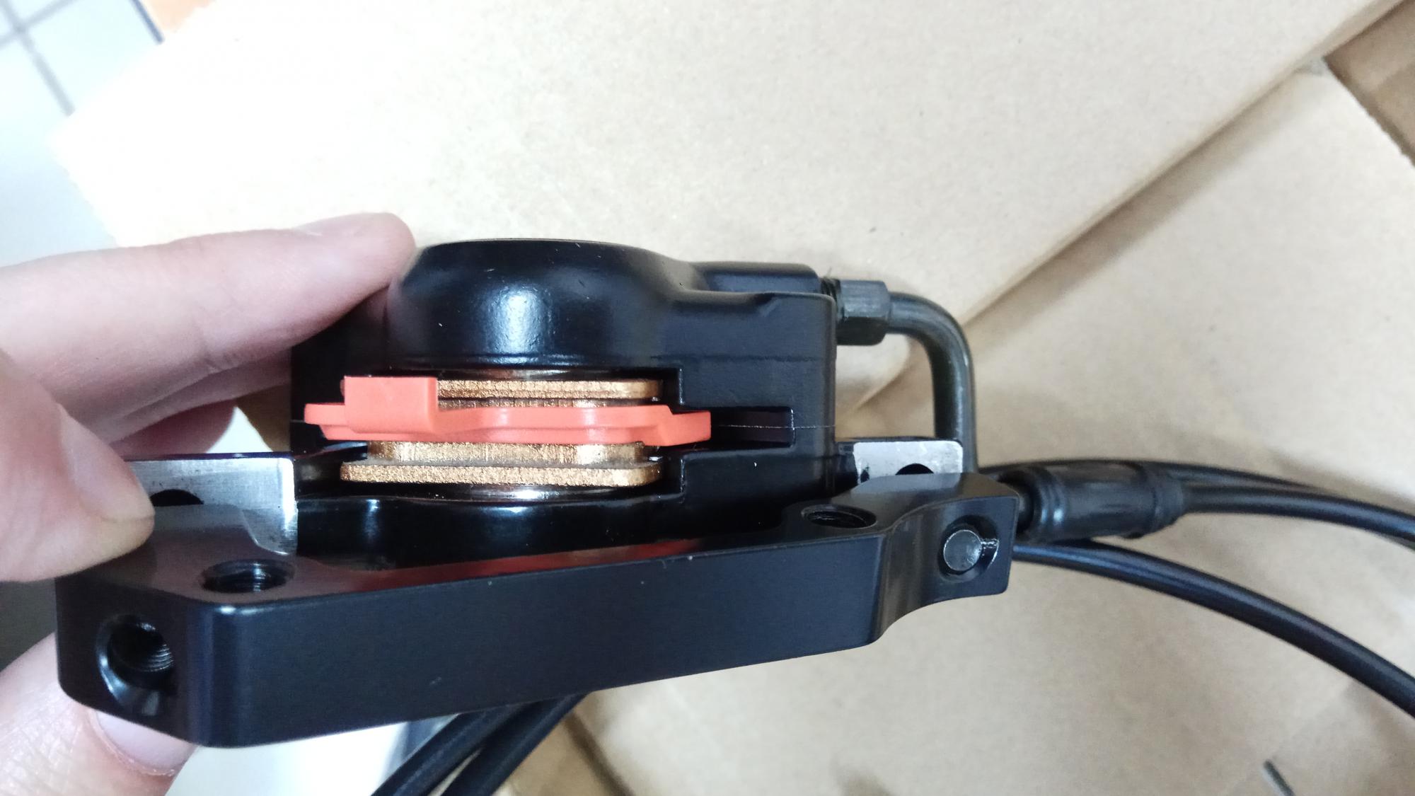 Это подвижная, а другая, неподвижная, ещё нормальная. Колодки фирменные, пришли вместе с тормозами. Регулировать их тоже замучился! То шоркают, то не тормозят, кое как нашёл нечто среднее с тормозами в конце хода тормозной ручки. Как регулировать знаю, у сына на веле эти же тормоза, только серебряного цвета( у меня чёрные) прошли около 5 тыс. до замены. И настроились легко, а с этими просто беда :~-(