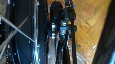 Велик китайский ашан-байк, тормоз был только задний ножной. Поскольку на заднюю вилку поставил мотор колесо, то и тормоз задний пропал. Переднего с завода не было. Ну и чтоб побыстрей выехать с гаража, на скорую руку наколхозил задний дисковый тормоз.  Вырезал крепление адаптера из 2 мм стали, снизу его прикрепил на болты в отверстия для болтов держателя багажника и крыла, третья опора - импровизированный хомут из 2 мм стали. Ну а положение калиппера подогнал с помощью шайб.