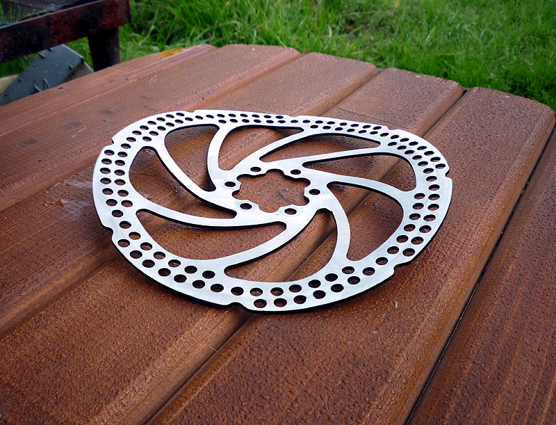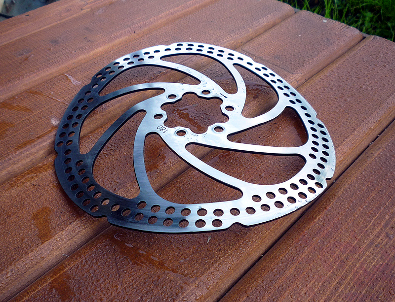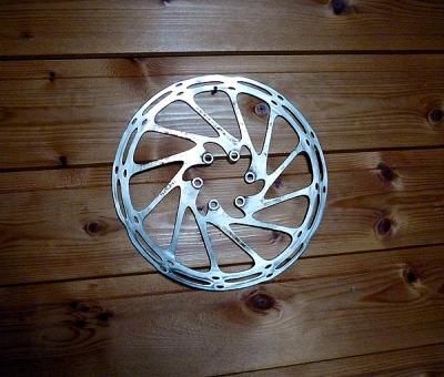 Первый выезд с этим ротором не был скоростным, т. к. ехал по убитой грунтовке. Вроде работает и работает тормоз, нормально работает. На следующий день поехал в другом направлении, по хорошему шоссе. Начал тормозить на скорости за 30 - вел тормозит рывками, аж с седла сдергивает. Что-то крутовато для притирания. Мож думаю налипло что. Осмотрел, нет, но следы от колодок неравномерные, при ровном роторе чуть меньше половины сегмента круга след шире. При этом не шоркает. Дома попытался поколдовать, а толку, если ротор неравномерный по толщине? При этом попытки его как-то помацать позволили выяснить, что это самый обычный пластилин для ашанов "на сдачу". Я никогда не имел дело с мягкими роторами, тормозами раньше пользовался в основном авидовскими, поэтому долго не мог понять, почему никак не удается нормально позиционировать калипер - колодки затирают то сегментами, то по всей окружности, то одна, то другая, в зависимости от того, в какую сторону пытаешься выправлять ротор. Плюнул, выкинул его нафиг, взял свой штатный, отшлифовал плоскостью с двумя типами наждачки, воткнул обратно, немного повозился с маленьким разводным ключом (используется в качестве правщика) - вуаля. Ничего не затирает, тормоз работает идеально. А все потому, что штатные срамовские роторы у Ино сделаны не ногами и не из теплого говна, нужно было только проявить терпение. А эту какашку, которую можно скрутить в трубочку, можно зато использовать как проставку-рассекатель для конфорки :D