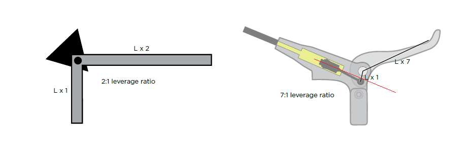 Brake levers are designed with the pivot positioned close to the pushrod. This provides increased leverage, where movement on the force input side of the lever produces less movement on the pushrod side, but also multiplies the input force by a factor equal to the leverage ratio to produce a greater output force to the master piston. Additionally, depending on how the push rod moves in relation to the lever pivot, leverage can change during the course of braking. This change in leverage is referred to as modulation. There are three types of modulation: