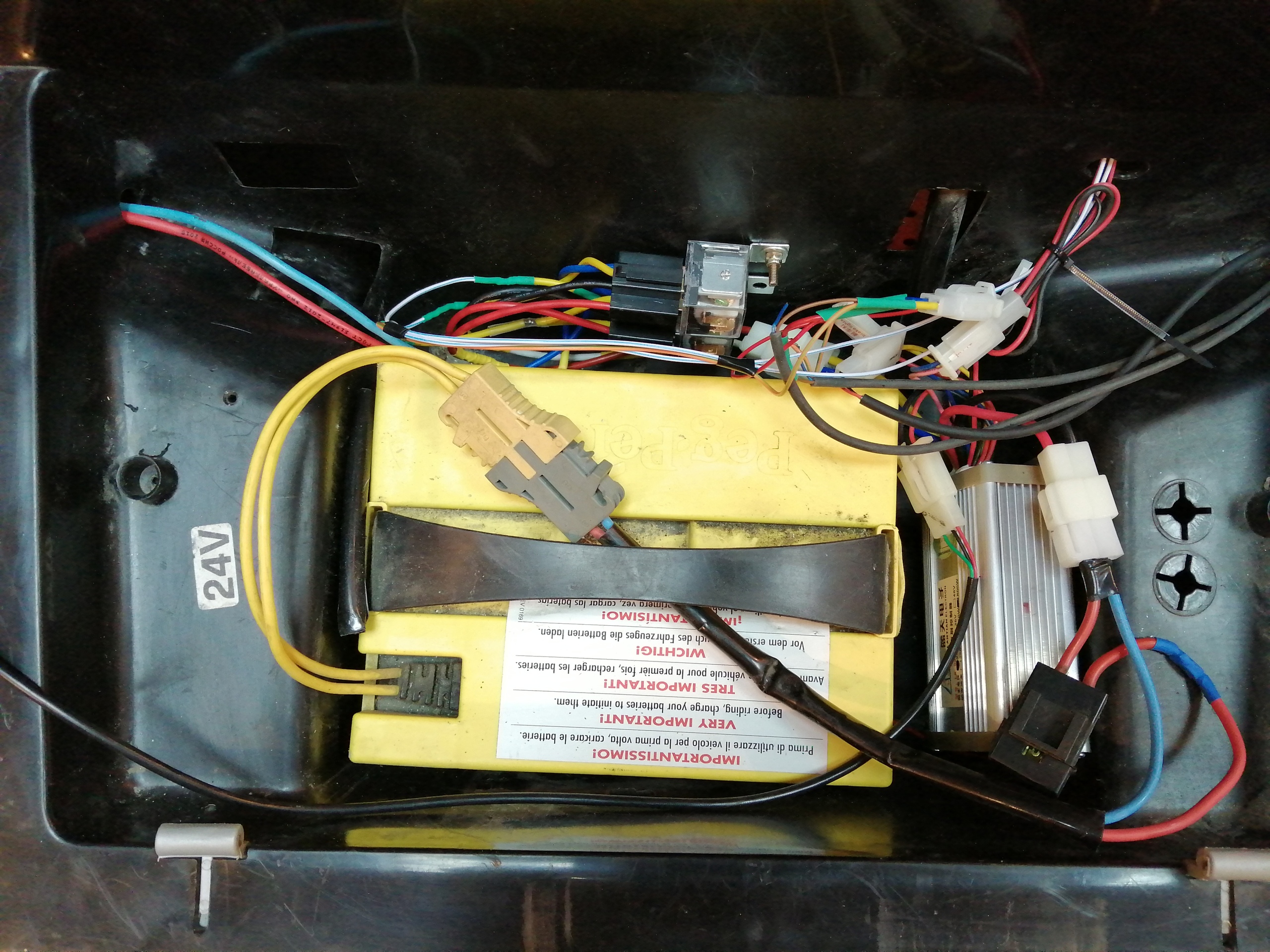 убито всё, кроме кузова и подвески. Пришлось восстанавливать с помощью китайских комплектующих - контроллер 24в 800Вт, педаль с датчиком Холла( родной механизм регулирования был уничтожен), реверс на 2 реле, дисковые тормоза работают, блокировки контроллера все восстановлены, дополнительно при сбросе питания срабатывает динамический тормоз.