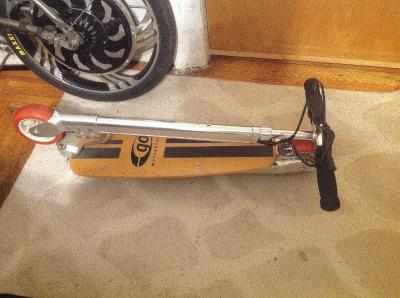 Самокатик довольно прикольный, очень компактный, весит 7кг вместе с батарейками. Чтобы поехал надо сначала ногой оттолкнуться, потом на курок жать. Максималка в районе 20км/ч.