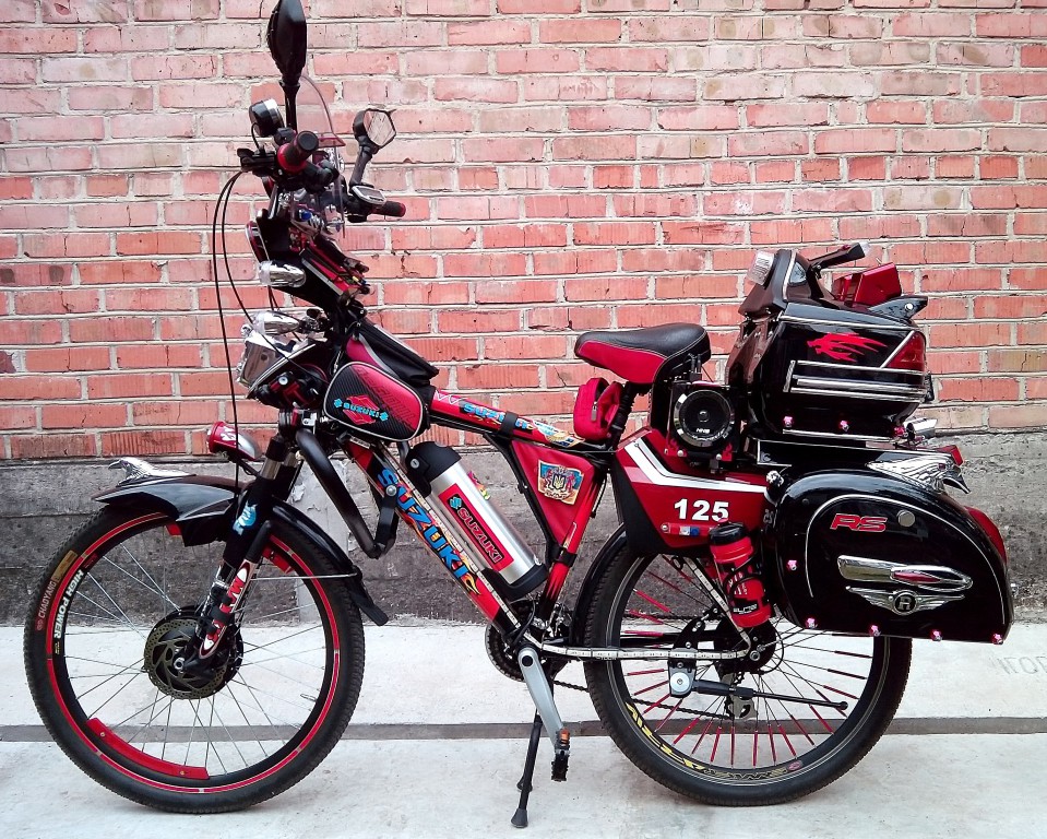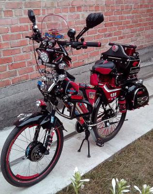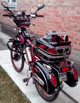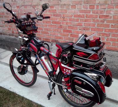 Основное электрооснащение: переднее редукторное моторколесо (Volta, 36в 500вт), контроллер (Volta, 36в 600 вт), литий полимерный аккумулятор бутылочного типа (36в 12Ач) на раме (для питания моторколеса) и ещё один кислотно-щелочной аккумулятор (12в 12Ач) на багажнике (для питания навигатора, видеорегистратора, бортового компьютера, усилителя колонок и светотехники), ручка газа рычажного типа, трёхпозиционный переключатель скоростей.