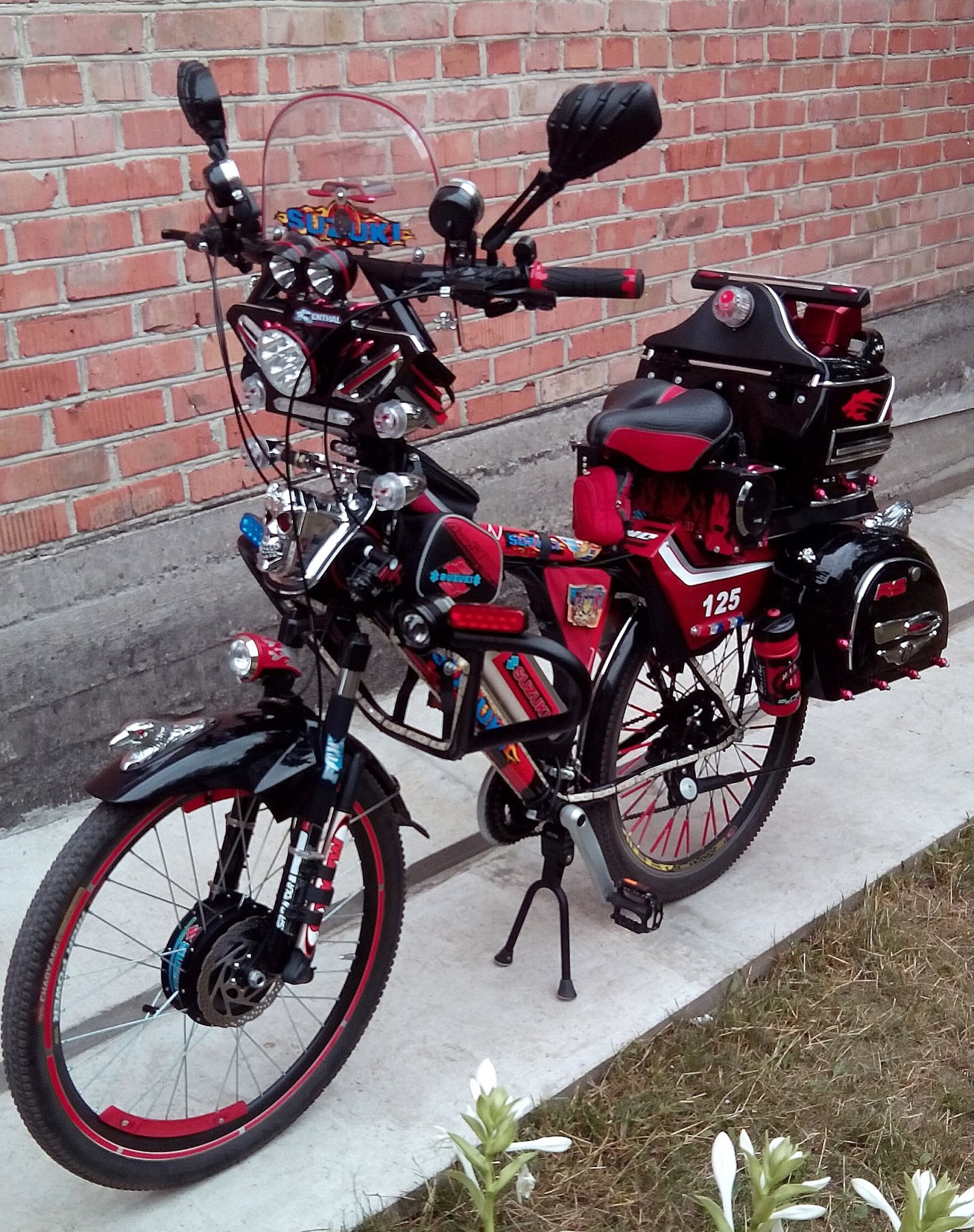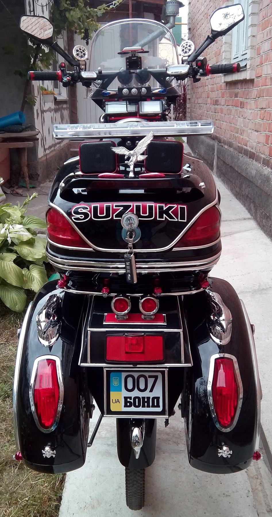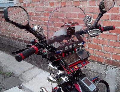 Дополнительно установлено: усилитель передней вилки, МП3 плеер, музыкальный усилитель и шесть колонок, велокомпьютер и бортовой комп, навигатор, видеорегистратор, шесть фар спереди, светотехника (сигналы поворотов, стопсигнал, сигнал аварийной остановки, сигнализация, цветная светодиодная лента с функцией цветомузыки и др. LED лампы различных эффектов), один центральный и два боковых кофра сзади. Пожалуй, за небольшим исключением, это весь установленный комплект...  :facepalm: