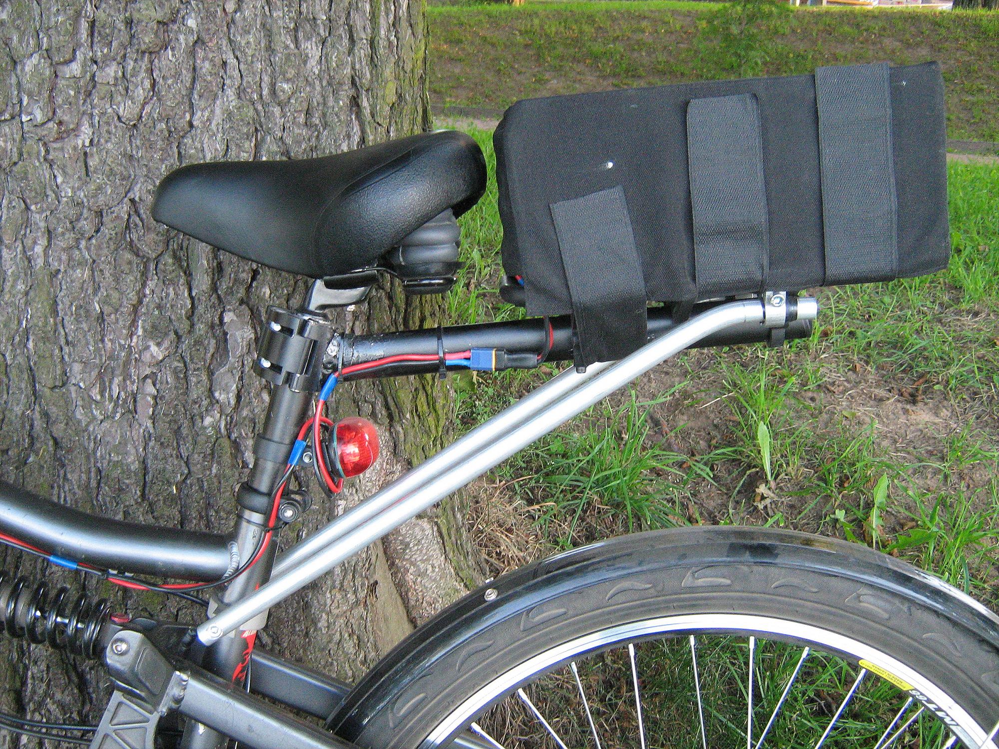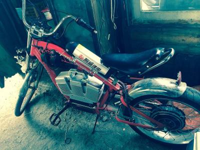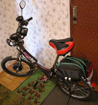 Вот решил после 2х сезонов покатушек по окрестным паркам г. Москвы (Кузьминки, Марьино ,Борисовские пруды и т.д.) выложить фото своего малолитражного эвела, на базе детского велосипеда STELS!  :-) "МК" 500вт. 36 вольт (DD), аккумулятор  48V-10Ah LiFe-Po4(реально ач по ваттметру не 10, а гдето 8!) . Средний пробег без педалей 35 км. на скорости 30-35 км.в час.С педалями до 60-70 км. Расход батареи в режиме круиз контроль на скорости 25-30 км. в час приблизительно 2.2 а.ч.на 10 км. Максимальная скорость до 45 км. в час по плоскачу без встречного ветра, с горки разгоняется до 55 км. в час.(после теста на скорость решил  лучше судьбу на таком хлипковатом средстве передвижения не испытывать). Вес около 30 кг. На руле закреплен ваттметр,велокамп, юсб разъем, муз. центр с колонками,рулевое освещение в ночное время суток,зеркала ,фара,габариты ,сигнал,регистратор,мини gps, сзади стоп сигнал,габарит ,поворотники. За все время эксплуатации общий пробег насчитывает около 6000 км.Уязвимое место это проводка ,в месте поворота руля,менял 2а раза провода на фару ,сигнал (обрывы). Следующий вариант ебайка планирую с минимальным обвесом ,на базе рамы Teleportator Lite. Мечтать ,как говорится не вредно для здоровья :-D.
