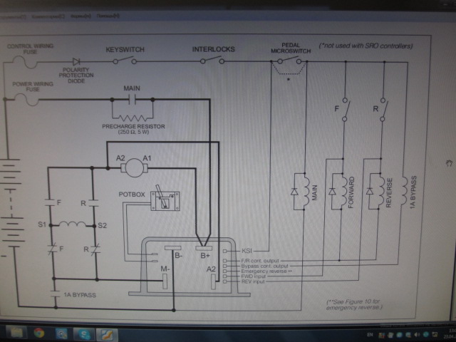 Оказывается контроллер - контроллеру рознь, разобрался сам, там есть отличия в реостате, один работал от 5ком и до 0, а другой наоборот. И ещё может кому понадобится выкладываю схемку соединения слаботочки! Короче на корпусе есть белый разьём с 5 пинами, и один рядом отдельно, так вот нужно третий средний пин (эмердженси реверс) и тот что отдельно стоящий (кси) соединить на + контактора, при включении замка зажигания включается главный контактор и подаёт питание на контроллер (как силовое так и слаботочку).     Ну и естественно выехал прокатиться, едет заметно быстрее, чем тогда, при 45 вольт. Но трос спидометра не подключен ещё.   Вот фото: