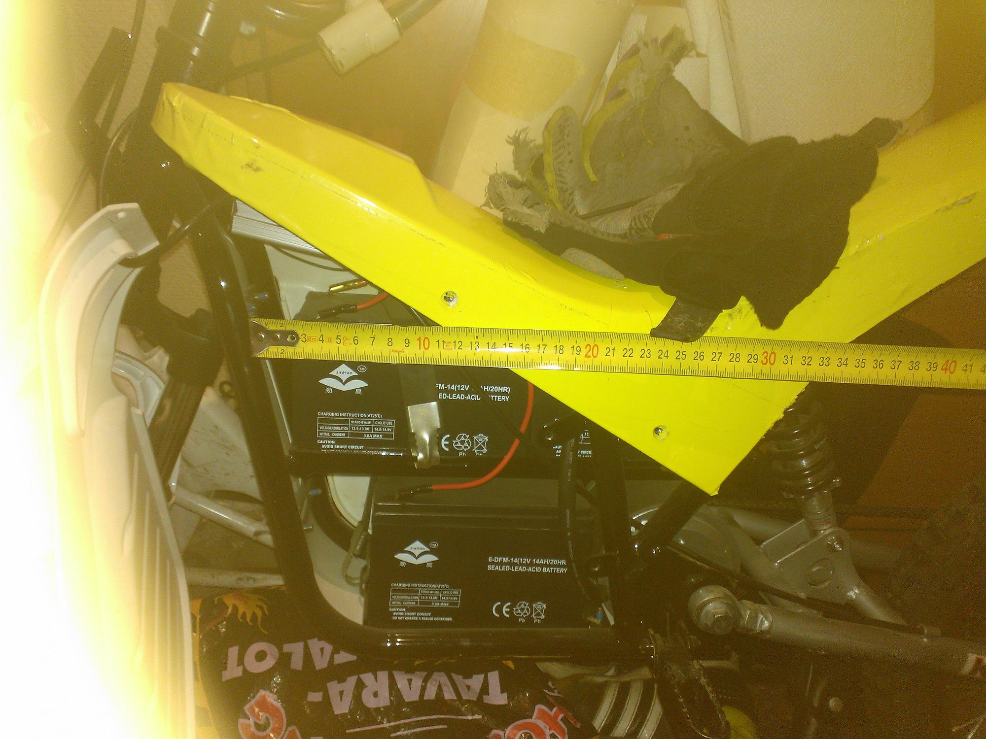 В теории еще есть мысли конвертировать в пит-самокат убрав верхнюю перекладину рамы, а вместо нижней вварить аккумное корыто от есамоката rhino  /:-) Тут зависит от того, потребуются ли на сабж права или можно и с текущей рамой будет его считать самокатным/велосипедным/"игрушечным".