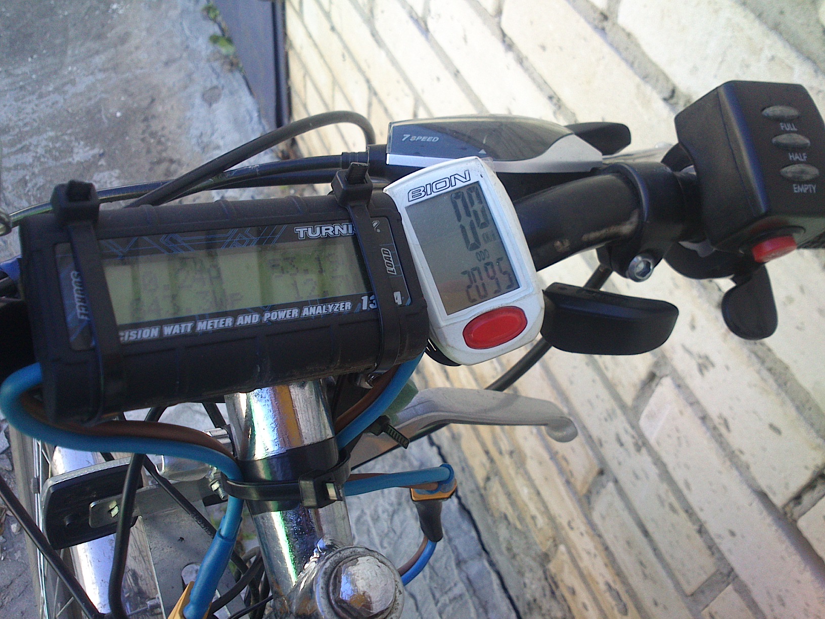 Батарея LiNMC 36В 16А/ч тогда стояла, массу велосипеда не знаю, батарейный ток был выставлен 20А, моя масса 75кило примерно, с одеждой и рюкзаком тяжелее :). С батареей LifePo4 48В 10А/ч пробег почти без педалирования был в начале осени 31км при батарейном 15А.