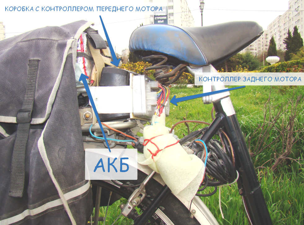 Полный привод . Задний DD Magic Pie-2 , передний редукторный Бафанг . АКБ-литий-титанат 48V 10Ah самосброка , ячейки Ю/Корея .  АКБ-лифер 36V 12Ah самосборка , ячейки-ЛЯО .