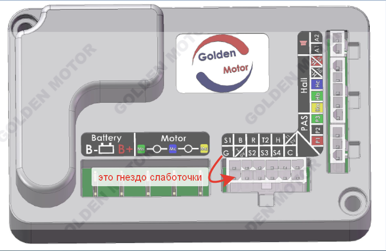 На контроллере , который управляет моим передним Бафанг-МК , слаботочка известна . А вот с  програмируемым GM-контроллером на заднем МК помогите разобраться . Вот схема с сайта [b-b]Golden Motor[/b-b] с моими вопросительными пометками . ==========================================================================================================  ========================================================================================================   Правильно ли я определил на ней слаботочку ? И где разъём этой слаботочки на корпусе контроллера ? - см. картинку