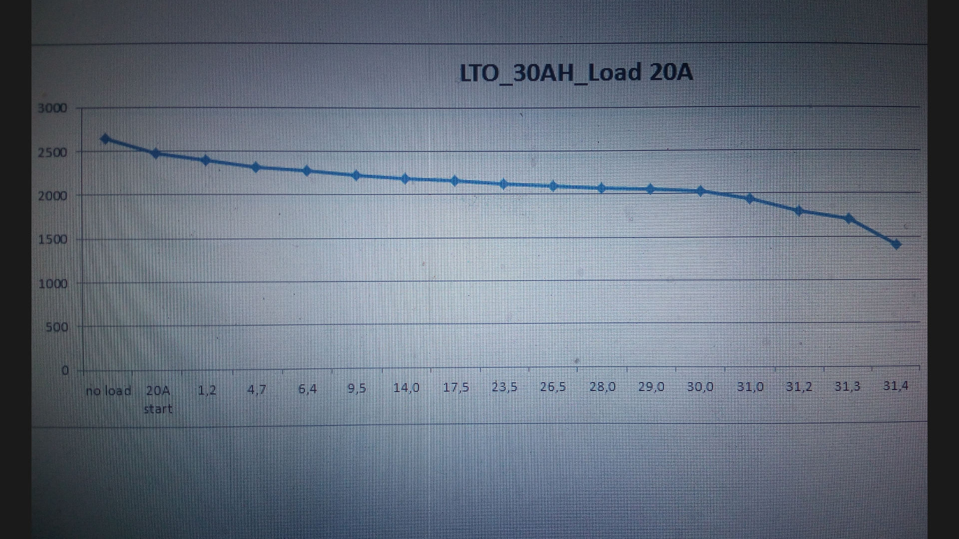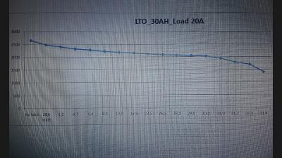 Пока разрядный график током в 20а. Последнее значение высчитано по скорости падения напряжения. Батарея отдала ~30ач в промежутке между 2.4 - 2в