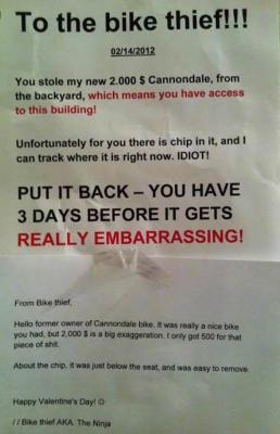 [user]Гиперкуница[/user], Ребята, легкий велик со всеми вашими блокировками на руках одному можно унести (а вдвоем тем более) . В крайнем случае поставил под блокированное колесо хоз.тележку и покатил себе домой этот "трофей"... Противоугонный тест показал, что вообще не существует стопроцентной защиты...(против "лома" - нет приема). Условно самое надежное противоугонное средство - это ваши глаза с видеорегистратором... !
