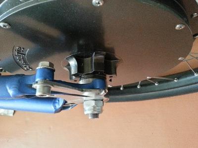 Не совсем удачное решение - прямо скажем. На моторе от Crystalyte подобный вывод проводов, - т.е. сбоку от оси.
