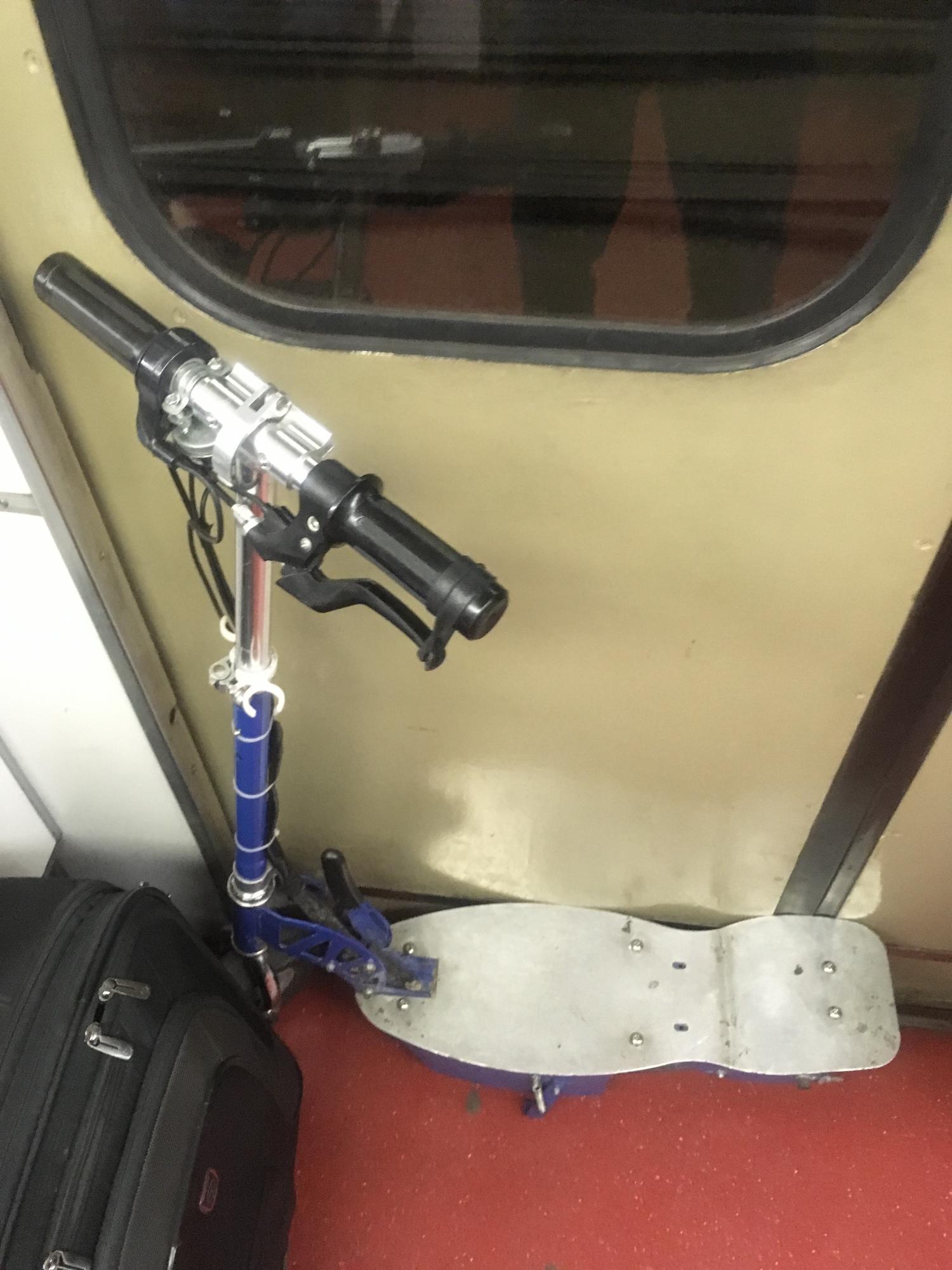 У меня такой же штурм вагонов, только я встаю так, чтоб заходить первым, сразу с краю двери, там же и ставится самокат и не занимает лишнего места, так как стою впритык к нему и боку лавки. Ну и сложенный самокат будет занимать больше места и пачкать всех