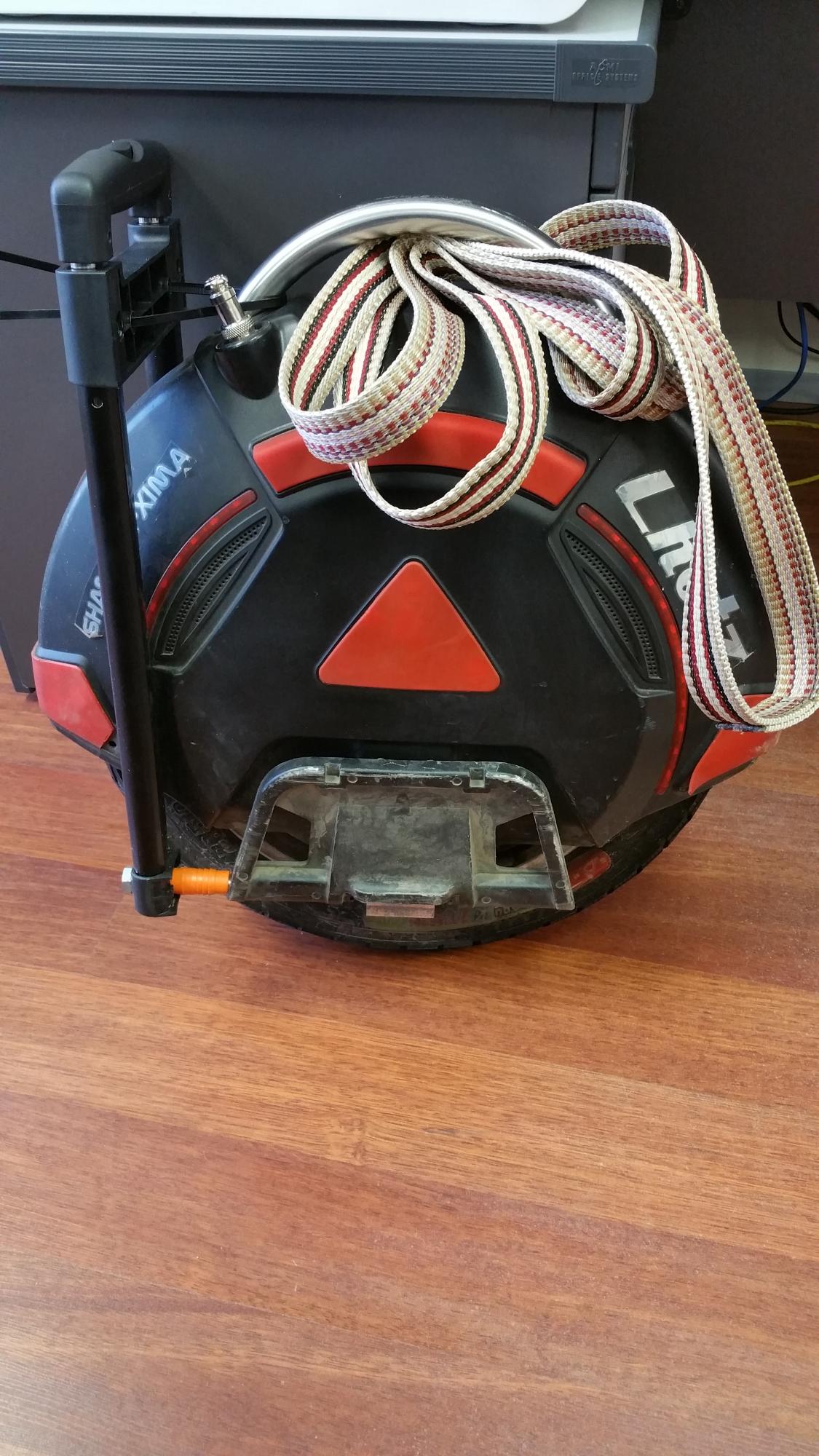Приделал к колесу ручку - купил от Kingsong 14, в целом неплохо, но колесо за ручку получается везти только во включенном состоянии, тогда его надо только направлять, само весело едет.