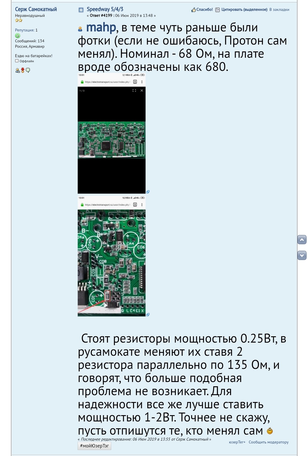Купил б/у самокат ,при покупке проверял все работало штатно ,потом после нескольких зарядок  пропала тяга в заднем колесе и значительно снизилась в переднем ,также пропали электронные тормоза .Самокат был отдан в ремонт в течении недели его отремонтировали.Ремонтировали контроллер.Стоимость ремонта 7т.Проездил я на нем не долго.Симптомы поломки похожие ,только теперь пропала тяга в переднем колесе и значительно снизилась в заднем,электронный тормоз работает.Отдавать второй раз в сервисный центр неохота .Читал что там скорее всего сгорел какой то из резисторов .Хочу сам попробовать найти и заменить сгоревший резистор .Так вот в связи с этим хотел спросить может кто сталкивался с подобной проблемой и самостоятельно ее устранял ,есть ли обзоры на эту тему или какая нибудь техническая информация .Заранее спасибо.