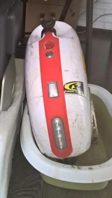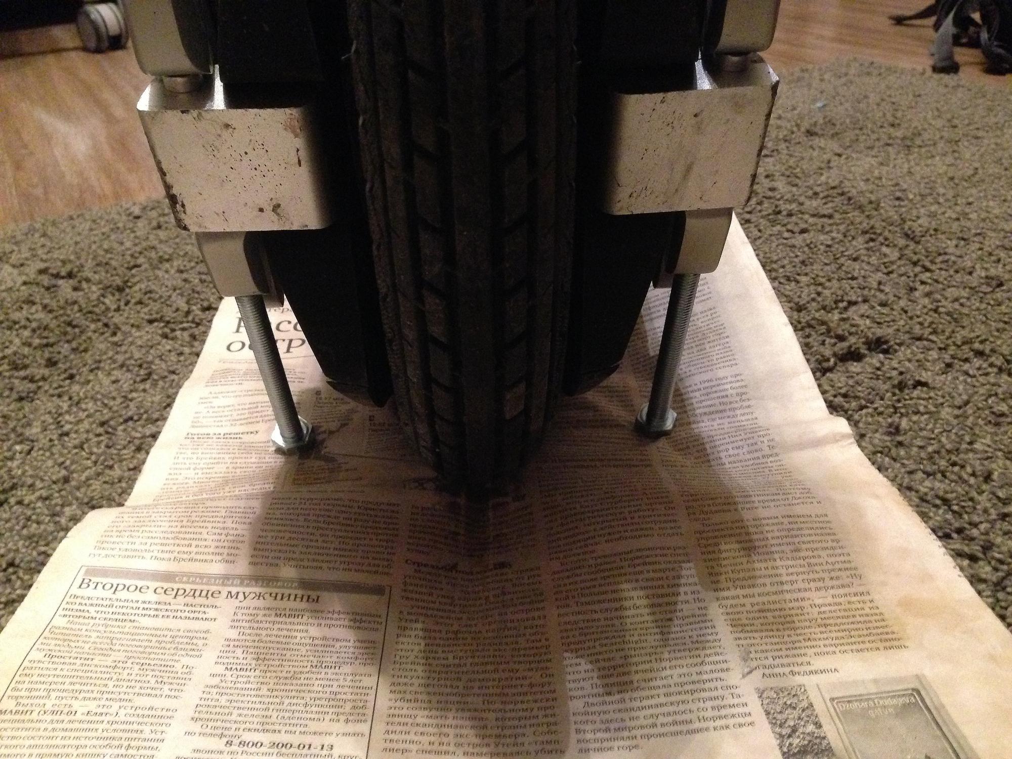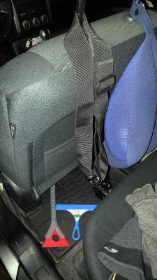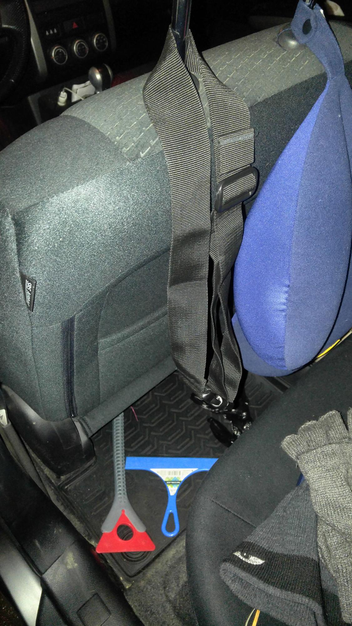 Выход нашелся вполне простой, я на "подзатыльник" водительского кресла прикрепил ремень с карабином, когда цепляю колесо, оно стоит практически вертикально, особо не болтается при движении и стекает всю жижу в резиновый коврик. Что бы не заморачиваться с выливанием, я просто подстилаю тряпочку, которую потом без заморочек удаляю.