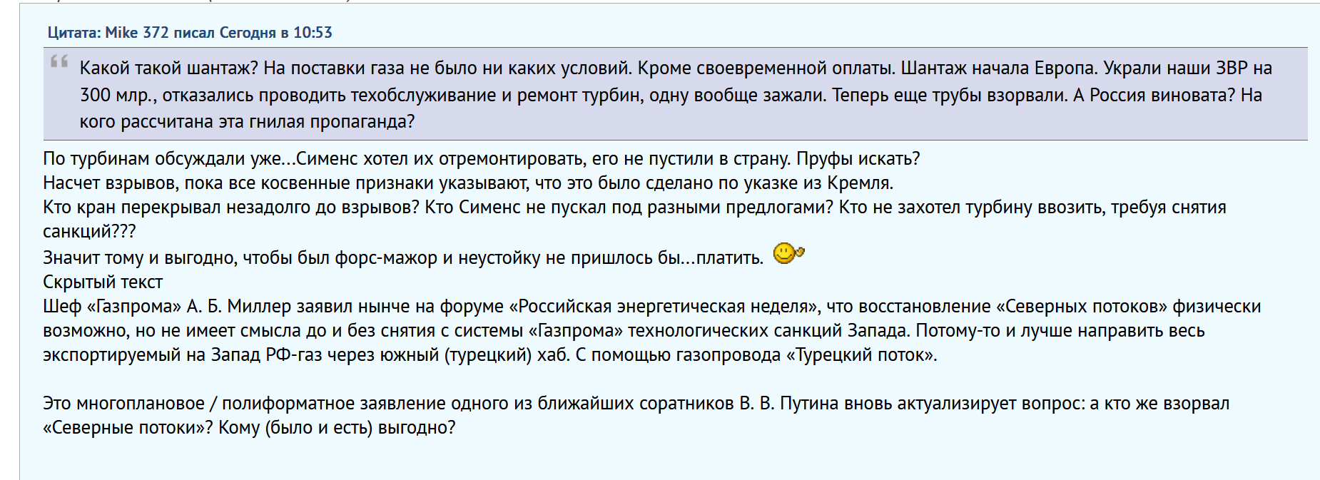 Вот свежий пример, речь зашла о Северном потоке, кто был виноват в снижении подачи газа, по чьей инициативе не произошел возврат отремонтированной турбины из Канады.