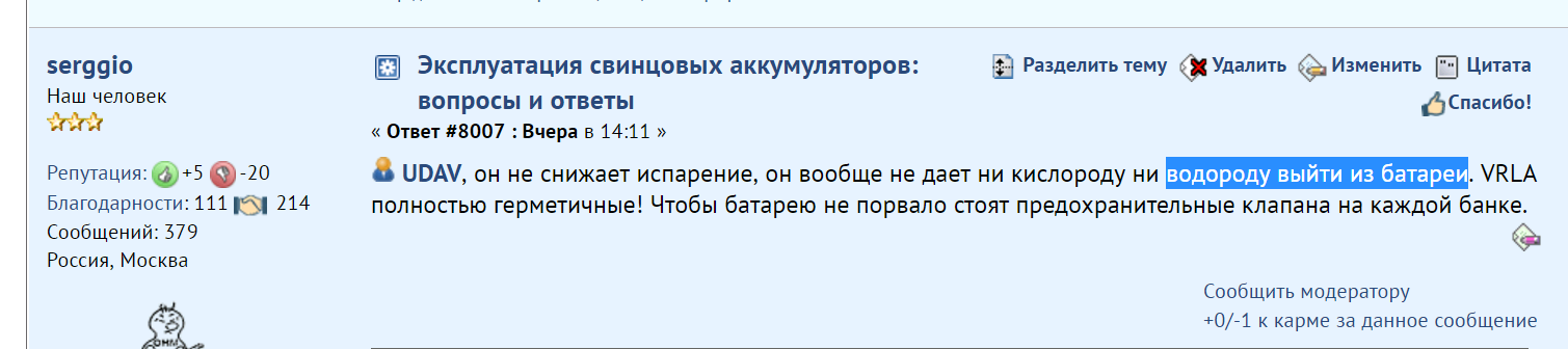 Для вас еще раз повторю. Процессы рекомбинации и технологии изготовления батареи для создания условий для этих процессов призваны не превращать батарею в хранилище а на определенной стадии заряда способствовать созданию условий для восполнения воды в в составе электролита, которая была бы гарантированно потеряно в обычной наливной батарее.