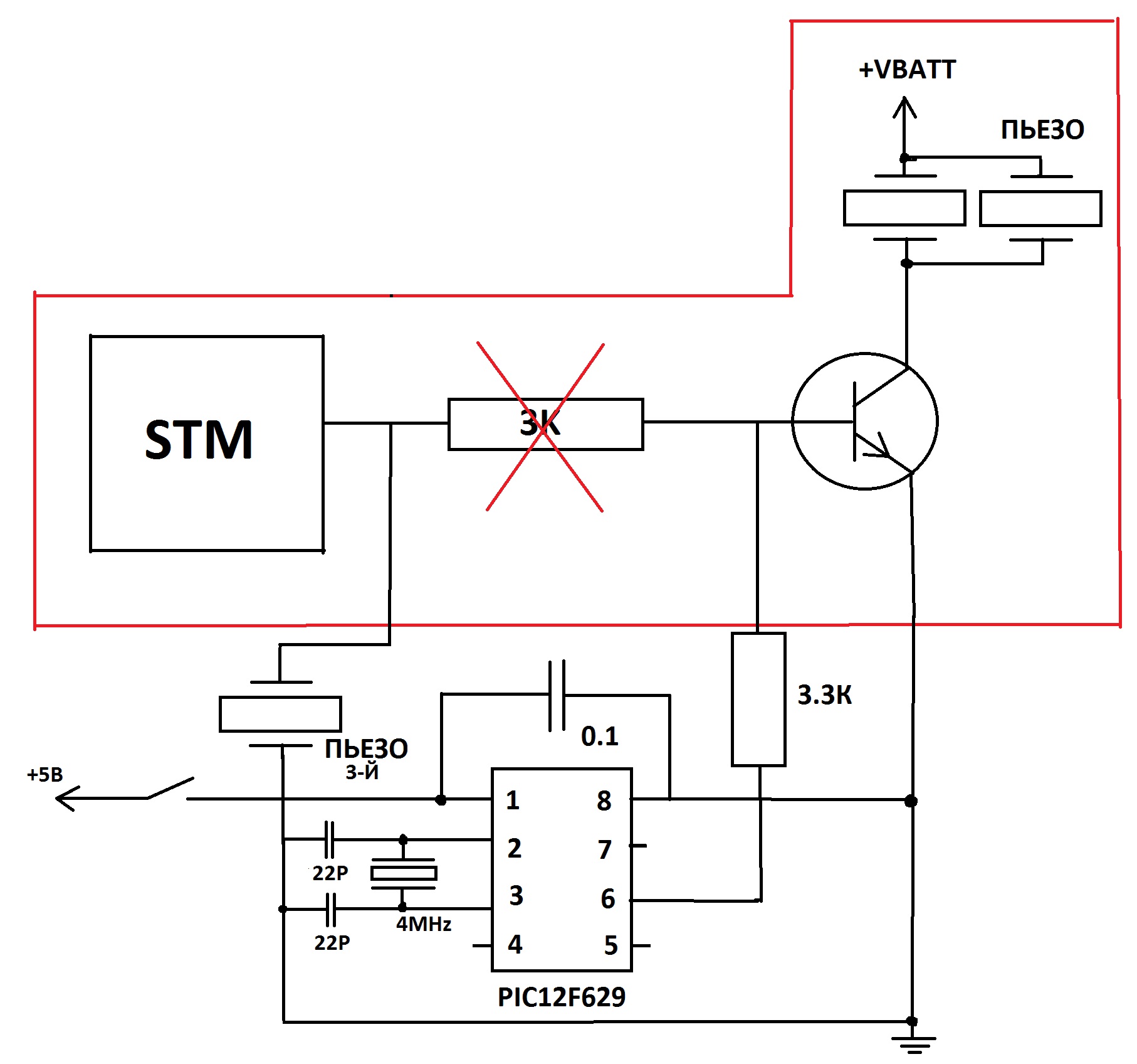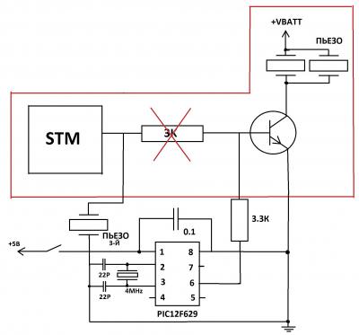 Красным обведена родная схема. Звук генерирует пик 629. Включение "крякалки" подачей питания на 1 ногу.