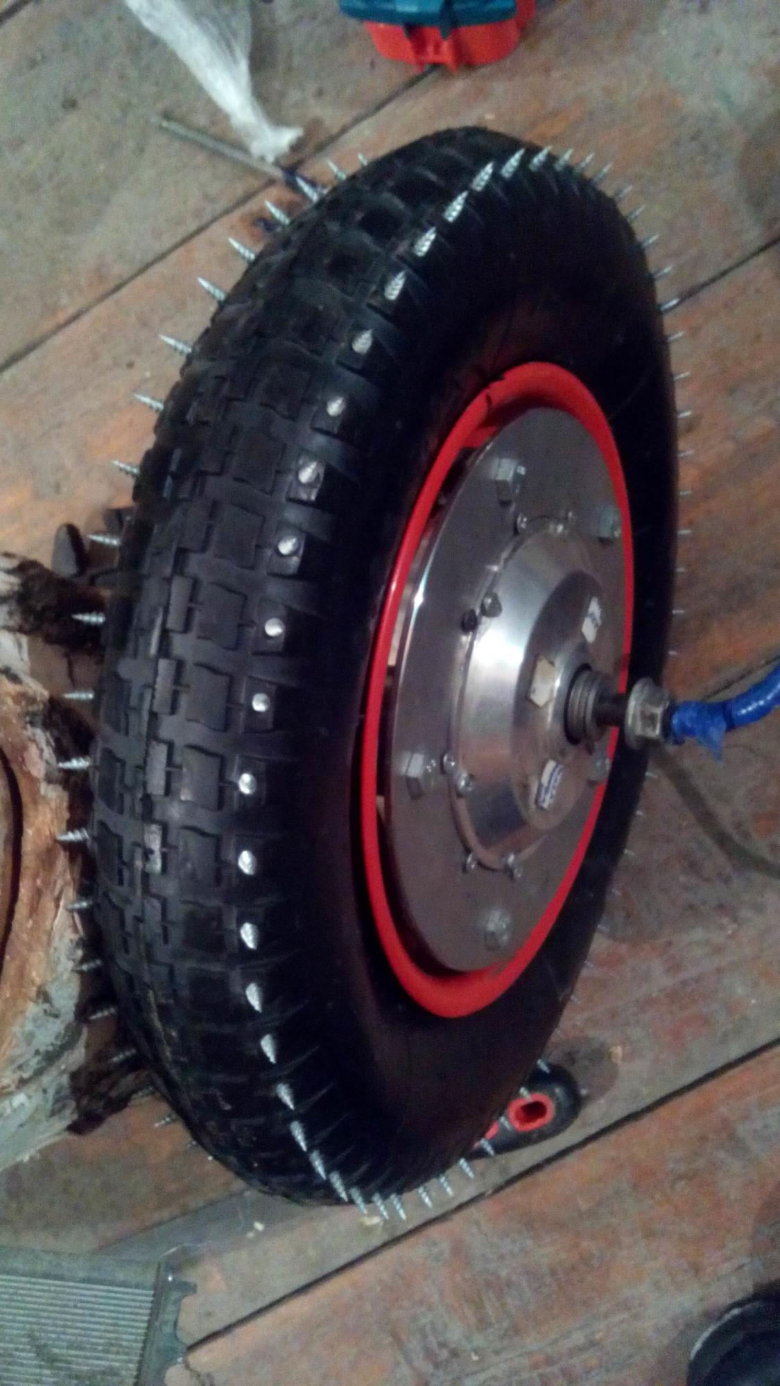 Переднее колесо шиповано болтами 3 мм, для защиты камеры от головок внутрь вставил еще 1 покрышку-слик чуть меньшего размера.