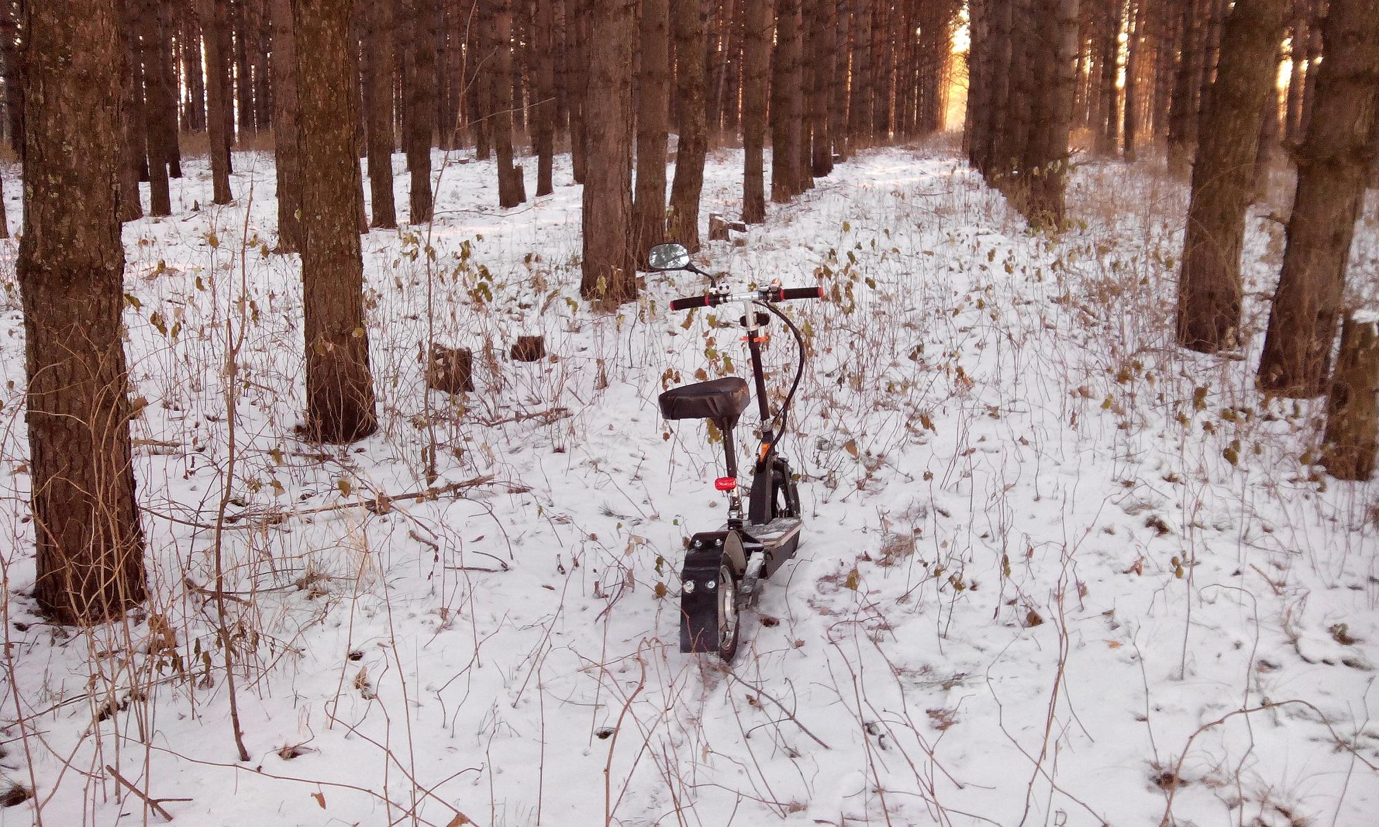 Лыжа возможно нужна будет  на рыхлом грунте, где колесо провалится. Хотя тогда и заднее тоже провалится, а мощи для этого мало. Не знаю, попробую, если придумаю как быстросъемно ее крепить. Я ж по парку в основном езжу, там может и нормально будет.