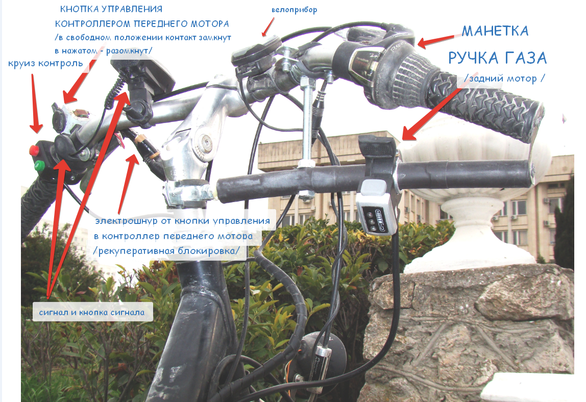[user]Vlad9669[/user] У меня на би-приводном эвеле у заднего МК курковая ручка газа - вне руля . Стоит , как бы , вверх ногами , но на функциональности это никак не отражается . Уже 2-й год езжу с таким конфигом . Пользуюсь обоими моторами раздельно и вместе , и манетку переключаю на ходу . ===========================================================================================================================