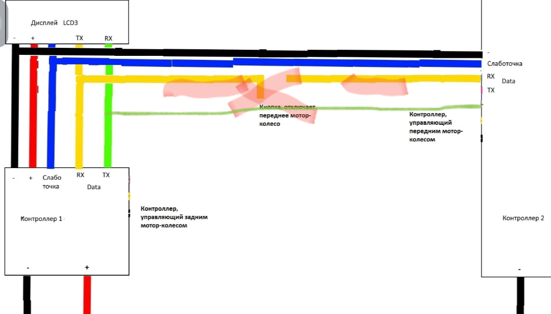Если первое,  то четвертый провод не нужен (как на исправлении в схеме). Кнопка тоже не нужна - контроллер переднего колеса отключается по другому. Нааример как [user]satell[/user] советует. Еще инфа есть в параллельной теме: