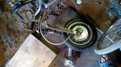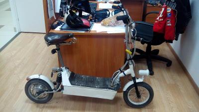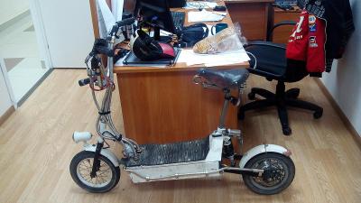 1. мотор - моторколесо бездатчиковое 350 Вт... От какого-то самоката, как меня уверил Уважаемый коллега с форума. У него была бракованая резина, которая была варварски срезена с мотора. В итоге мотор оказался в корпусе "под спицы". Соответственно был заспицован моим сыном в обод от детской коляски. Он оказался очень жесткий и 12-ти спицевый. Досверлив нужное количество отверстий - был получен обод на 36 спиц. В качестве спиц использованы старые (сломаные, но бережно хранимые) спицы от Советского еще мопеда. :)