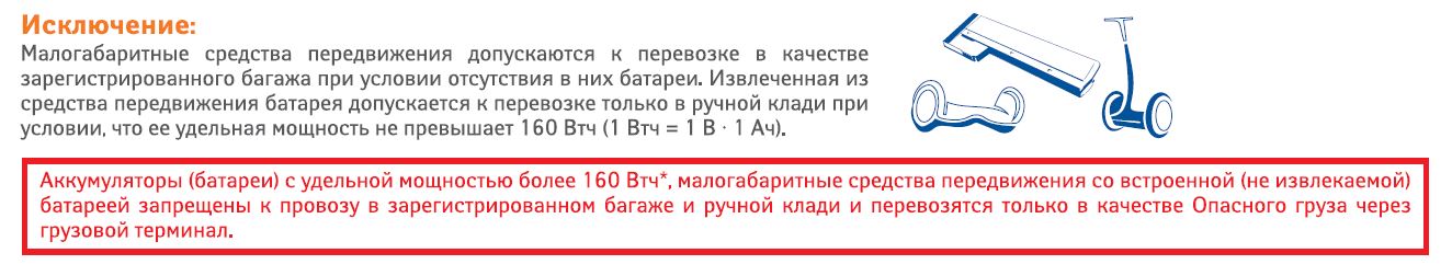 "Запрещено провозить на борту: Малогабаритные средства для личного передвижения, работающие на литиевых батареях и другие опасные вещества, предметы и грузы, которые могут быть использованы в качестве орудия нападения на пассажиров, экипаж воздушного судна, а также создающие угрозу полета воздушного судна."