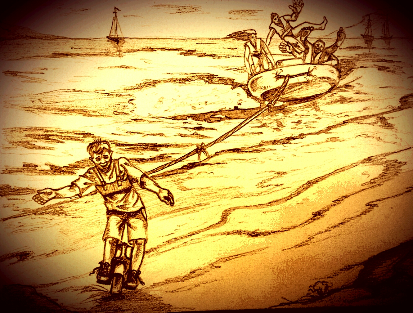 По песку на колесе, ещё и тянет сёрфера? Волшебство.